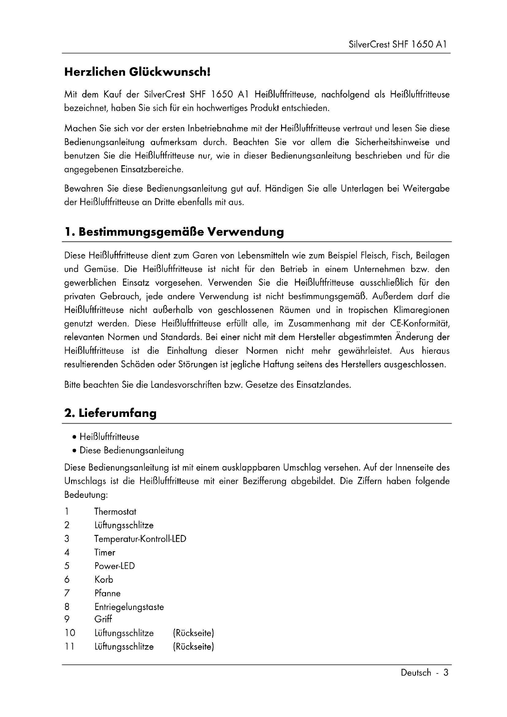Heißluftfritteuse Diese Bedienungsanleitung Diese Bedienungsanleitung ist mit einem ausklappbaren Umschlag versehen. Auf der Innenseite des Umschlags ist die Heißluftfritteuse mit einer Bezifferung abgebildet. Die Ziffern haben folgende Bedeutung: 1 Thermostat 2 Lüftungsschlitze 3 Temperatur-Kontroll-LED 4 Timer 5 Power-LED 6 Korb 7 Pfanne 8 Entriegelungstaste 9 Griff 10 Lüftungsschlitze (Rückseite) 11 Lüftungsschlitze (Rückseite)SilverCrest SHF 1650 A1