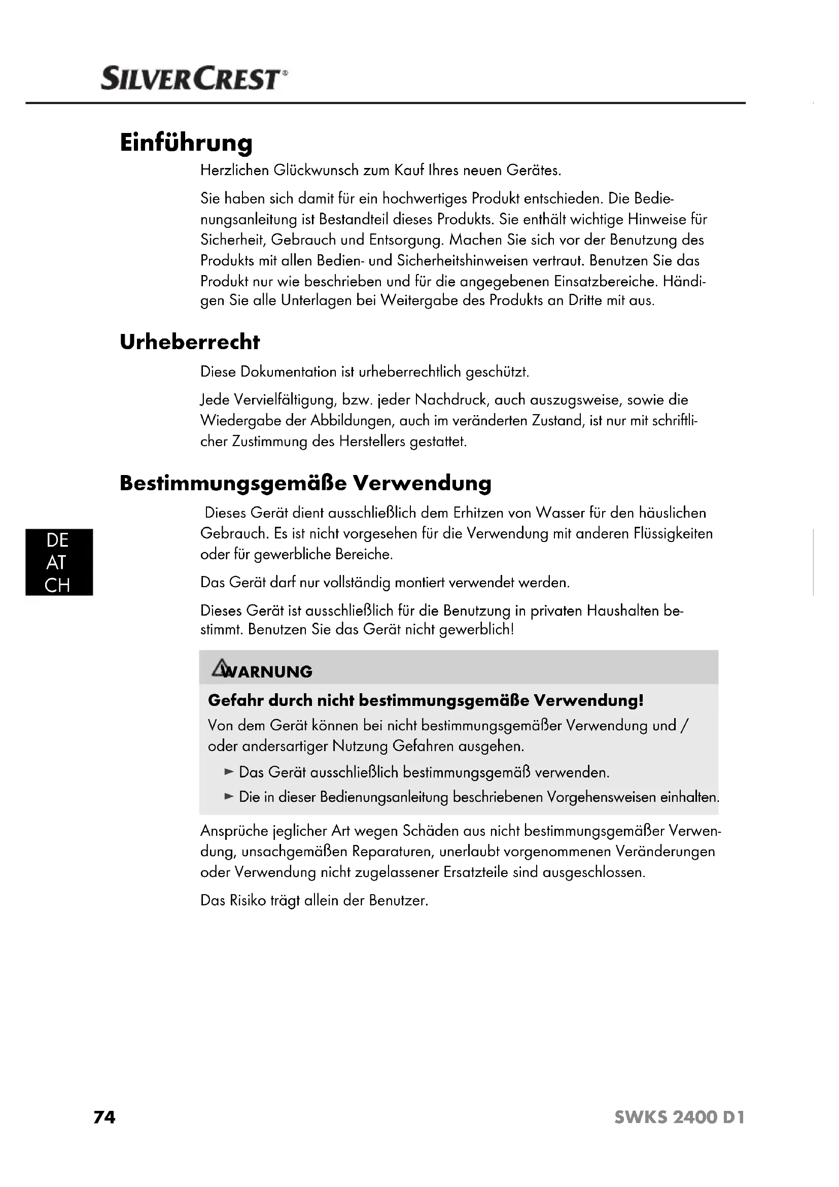 Einführung Herzlichen Glückwunsch zum Kauf Ihres neuen Gerätes. Sie haben sich damit für ein hochwertiges Produkt entschieden. Die Bedie- nungsanleitung ist Bestandteil dieses Produkts. Sie enthält wichtige Hinweise für Sicherheit, Gebrauch und Entsorgung. Machen Sie sich vor der Benutzung des Produkts mit allen Bedien- und Sicherheitshinweisen vertraut. Benutzen Sie das Produkt nur wie beschrieben und für die angegebenen Einsatzbereiche. Händi- gen Sie alle Unterlagen bei Weitergabe des Produkts an Dritte mit aus. Urheberrecht Diese Dokumentation ist urheberrechtlich geschützt. Jede Vervielfältigung, bzw. jeder Nachdruck, auch auszugsweise, sowie die Wiedergabe der Abbildungen, auch im veränderten Zustand, ist nur mit schriftli- cher Zustimmung des Herstellers gestattet. Bestimmungsgemäße Verwendung Dieses Gerät dient ausschließlich dem Erhitzen von Wasser für den häuslichen Gebrauch. Es ist nicht vorgesehen für die Verwendung mit anderen Flüssigkeiten oder für gewerbliche Bereiche. Das Gerät darf nur vollständig montiert verwendet werden. Dieses Gerät ist ausschließlich für die Benutzung in privaten Haushalten be- stimmt. Benutzen Sie das Gerät nicht gewerblich! WARNUNG Gefahr durch nicht bestimmungsgemäße Verwendung! Von dem Gerät können bei nicht bestimmungsgemäßer Verwendung und / oder andersartiger Nutzung Gefahren ausgehen. ► Das Gerät ausschließlich bestimmungsgemäß verwenden. ► Die in dieser Bedienungsanleitung beschriebenen Vorgehensweisen einhalten. Ansprüche jeglicher Art w egen Schäden aus nicht bestimmungsgemäßer Verwen- dung, unsachgemäßen Reparaturen, unerlaubt vorgenommenen Veränderungen oder Verwendung nicht zugelassener Ersatzteile sind ausgeschlossen. Das Risiko trägt allein der Benutzer.75 SWKS 2400 D1
