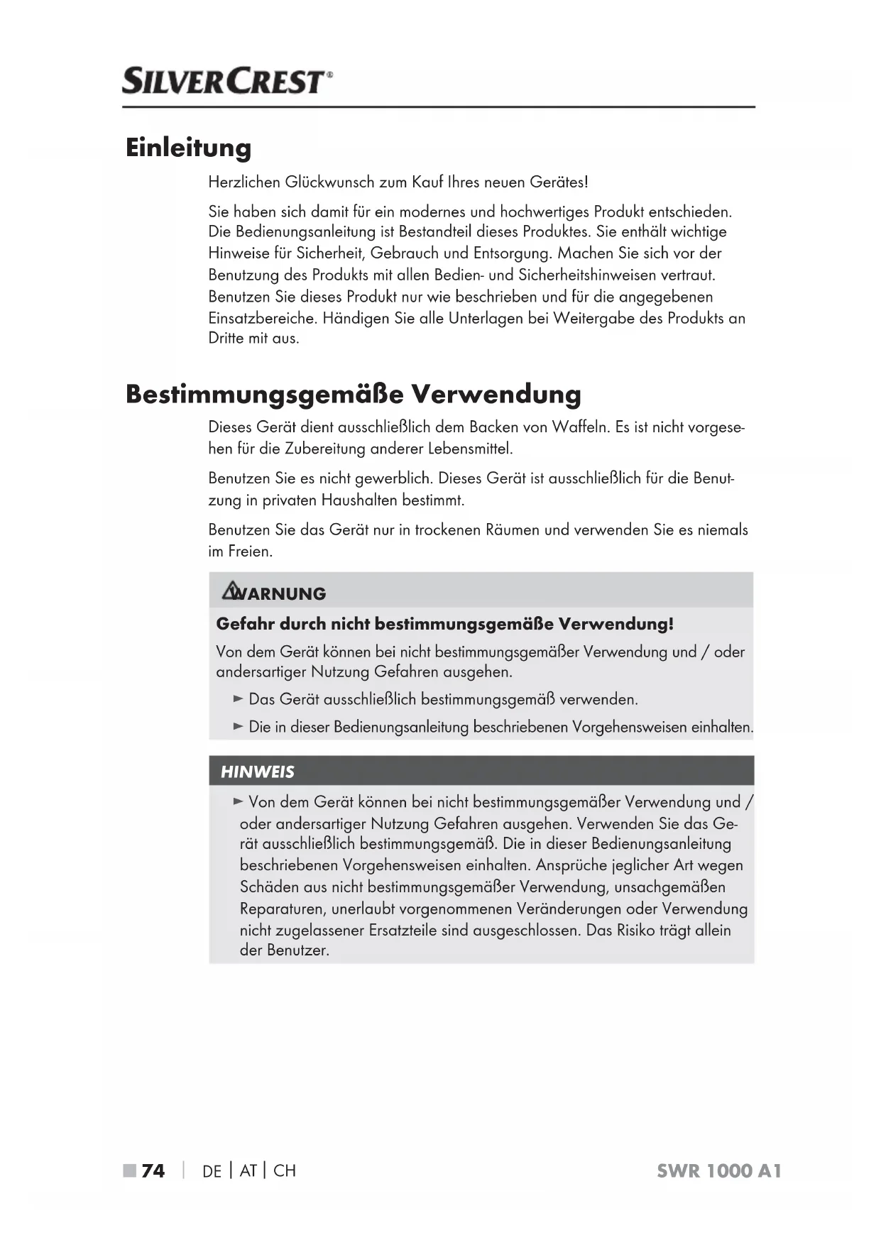 SWR 1000 A1 Einleitung Herzlichen Glückwunsch zum Kauf Ihres neuen Gerätes! Sie haben sich damit für ein modernes und hochwertiges Produkt entschieden. Die Bedienungsanleitung ist Bestandteil dieses Produktes. Sie enthält wichtige Hinweise für Sicherheit, Gebrauch und Entsorgung. Machen Sie sich vor der Benutzung des Produkts mit allen Bedien- und Sicherheitshinweisen vertraut. Benutzen Sie dieses Produkt nur wie beschrieben und für die angegebenen Einsatzbereiche. Händigen Sie alle Unterlagen bei Weitergabe des Produkts an Dritte mit aus. Bestimmungsgemäße Verwendung Dieses Gerät dient ausschließlich dem Backen von Waffeln. Es ist nicht vorgese- hen für die Zubereitung anderer Lebensmittel. Benutzen Sie es nicht gewerblich. Dieses Gerät ist ausschließlich für die Benut- zung in privaten Haushalten bestimmt. Benutzen Sie das Gerät nur in trockenen Räumen und verwenden Sie es niemals im Freien. WARNUNG Gefahr durch nicht bestimmungsgemäße Verwendung! Von dem Gerät können bei nicht bestimmungsgemäßer Verwendung und / oder andersartiger Nutzung Gefahren ausgehen. ► Das Gerät ausschließlich bestimmungsgemäß verwenden. ► Die in dieser Bedienungsanleitung beschriebenen Vorgehensweisen einhalten. HINWEIS ► Von dem Gerät können bei nicht bestimmungsgemäßer Verwendung und / oder andersartiger Nutzung Gefahren ausgehen. Verwenden Sie das Ge- rät ausschließlich bestimmungsgemäß. Die in dieser Bedienungsanleitung beschriebenen Vorgehensweisen einhalten. Ansprüche jeglicher Art wegen Schäden aus nicht bestimmungsgemäßer Verwendung, unsachgemäßen Reparaturen, unerlaubt vorgenommenen Veränderungen oder Verwendung nicht zugelassener Ersatzteile sind ausgeschlossen. Das Risiko trägt allein der Benutzer.DE