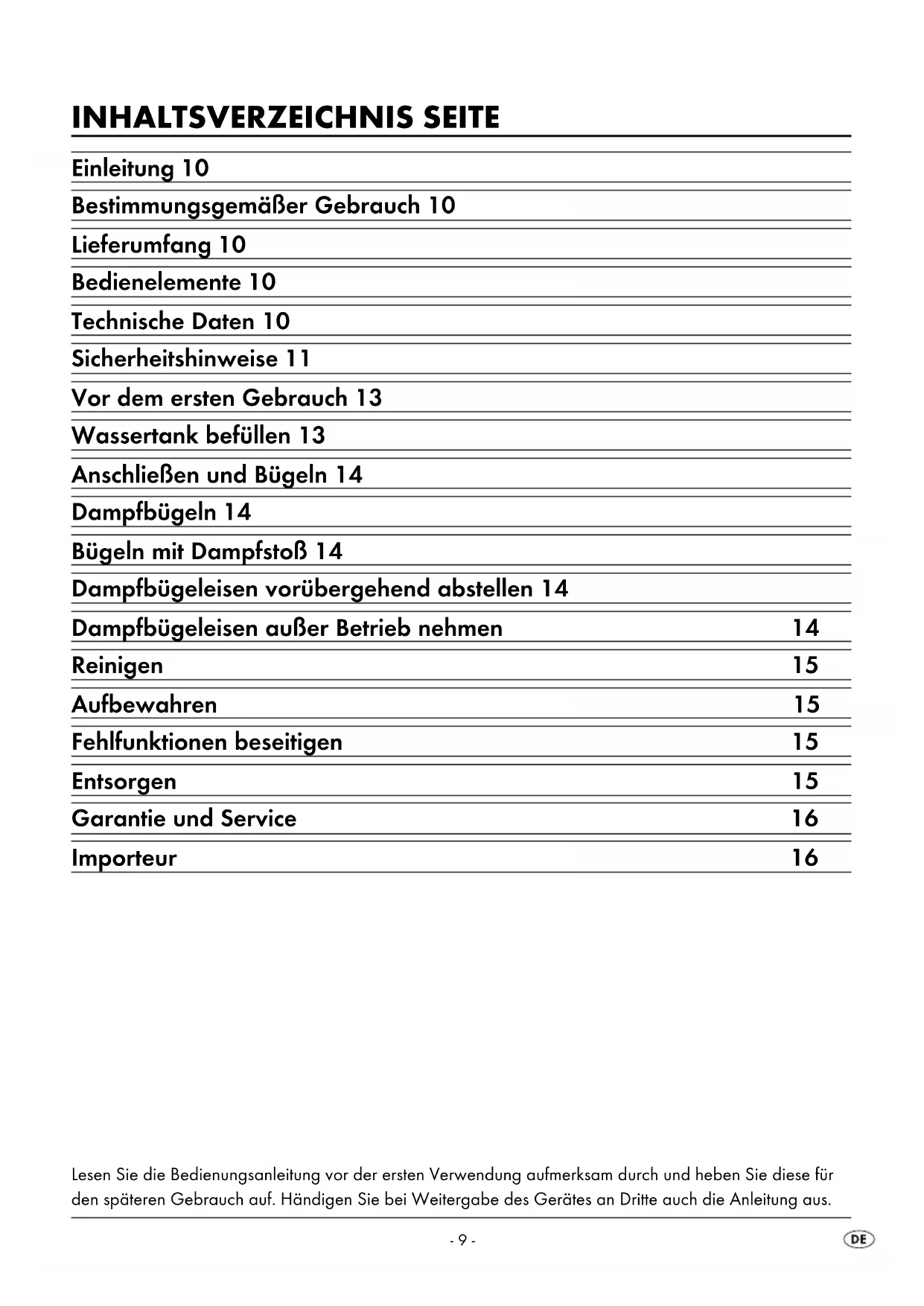 - Das Dampfbügeleisen ist defekt. Lassen Sie das Dampfbügeleisen von qualifiziertem Fachperso- nal reparieren. Entsorgen Werfen Sie das Gerät keinesfalls in den normalen Hausmüll. Dieses Produkt unterliegt der europäischen Richtlinie 2002/96/EC. Entsorgen Sie das Gerät über einen zugelassenen Entsorgungsbetrieb oder über Ihre kommunale Entsorgungseinrichtung. Beachten Sie die aktuell geltenden Vorschriften. Setzen Sie sich im Zweifelsfall mit Ihrer Entsorgungs- einrichtung in Verbindung. Führen Sie alle Verpackungsmaterialien einer umweltgerechten Entsorgung zu.- 16 - Garantie und Service Sie erhalten auf dieses Gerät 3 Jahre Garantie ab Kaufdatum. Das Gerät wurde sorgfältig produziert und vor Anlieferung gewissenhaft geprüft. Bitte bewahren Sie den Kassenbon als Nachweis für den Kauf auf. Bitte setzen Sie sich im Garantie- fall mit Ihrer Servicestelle telefonisch in Verbindung. Nur so kann eine kostenlose Einsendung Ihrer Ware gewährleistet werden. Die Garantieleistung gilt nur für Material- oder Fabrikationsfehler, nicht aber für Transportschäden, Verschleißteile oder für Beschädigungen an zer- brechlichen Teilen, z. B. Schalter oder Akkus. Das Produkt ist lediglich für den privaten und nicht für den gewerblichen Gebrauch bestimmt. Bei missbräuchlicher und unsachgemäßer Behand- lung, Gewaltanwendung und bei Eingriffen, die nicht von unserer autorisierten Service-Niederlas- sung vorgenommen wurden, erlischt die Garantie. Ihre gesetzlichen Rechte werden durch diese Garantie nicht eingeschränkt. Die Garantiezeit wird durch die Gewährleistung nicht verlängert. Dies gilt auch für ersetzte und repa- rierte Teile. Eventuell schon beim Kauf vorhandene Schäden und Mängel müssen sofort nach dem Auspacken gemeldet werden, spätestens aber zwei Tage nach Kaufdatum. Nach Ablauf der Garantie- zeit anfallende Reparaturen sind kostenpflichtig. Service Deutschland Tel.: 01805772033 (0,14 EUR/Min. aus dem dt. Festnetz, Mobilfunk max. 0,42 EUR/Min.) E-Mail: kompernass@lidl.de Service Österreich Tel.: 0820 201 222 (0,15 EUR/Min.) E-Mail: kompernass@lidl.at Service Schweiz Tel.: 0842 665566 (0,08 CHF/Min., Mobilfunk max. 0,40 CHF/Min.) E-Mail: kompernass@lidl.ch Importeur KOMPERNASS GMBH BURGSTRASSE 21 44867 BOCHUM, DEUTSCHLAND www.kompernass.com IAN 88711 IAN 88711 IAN 88711- 17 - CONTENT PAGE Introduction 18 Intended use 18 Scope of delivery 18 Operating elements 18 Technical data 18 Safety instructions 19 Before initial use 21 Filling the water tank 21 Plugging in and ironing 22 Steam ironing 22 Ironing with steam blast 22 Temporarily setting the steam iron aside 22 Turning off the steam iron 22 Cleaning 23 Storage 23 Troubleshooting 23 Disposal 23 Warranty and service 24 Importer 24 Read the operating instructions carefully before using the device for the first time and keep this booklet for later reference. Pass this manual on to whoever might acquire the device at a future date.- 18 - STEAM IRON Introduction Congratulations on the purchase of your new appli- ance. You have clearly decided in favour of a quality pro- duct. These operating instructions are a constituent of this product. They contain important information with regard to safety, use and disposal. Before using the product, familiarise yourself with all of these ope- rating and safety instructions. Use the product only as described and only for the specified areas of appli- cation. Please also pass these documents on to any future owner, together with the product. Intended use The steam iron is exclusively intended for ironing textiles. The iron may only be used indoors and in private households. Any other use is deemed improper. The apparatus is not intended for com- mercial use! Scope of delivery Steam Iron Measuring beaker Operating instructions Operating elements 1 Water jet 2 Filler opening for the water tank 3 Steam regulator 4 Button for steam blast 5 Button for fine water spray 6 Thermostat 7 Temperature control lamp 8 Power cable with anti-kink protection 9 Appliance base 0 Ironing sole Technical data Power supply voltage: 220 - 240 V
