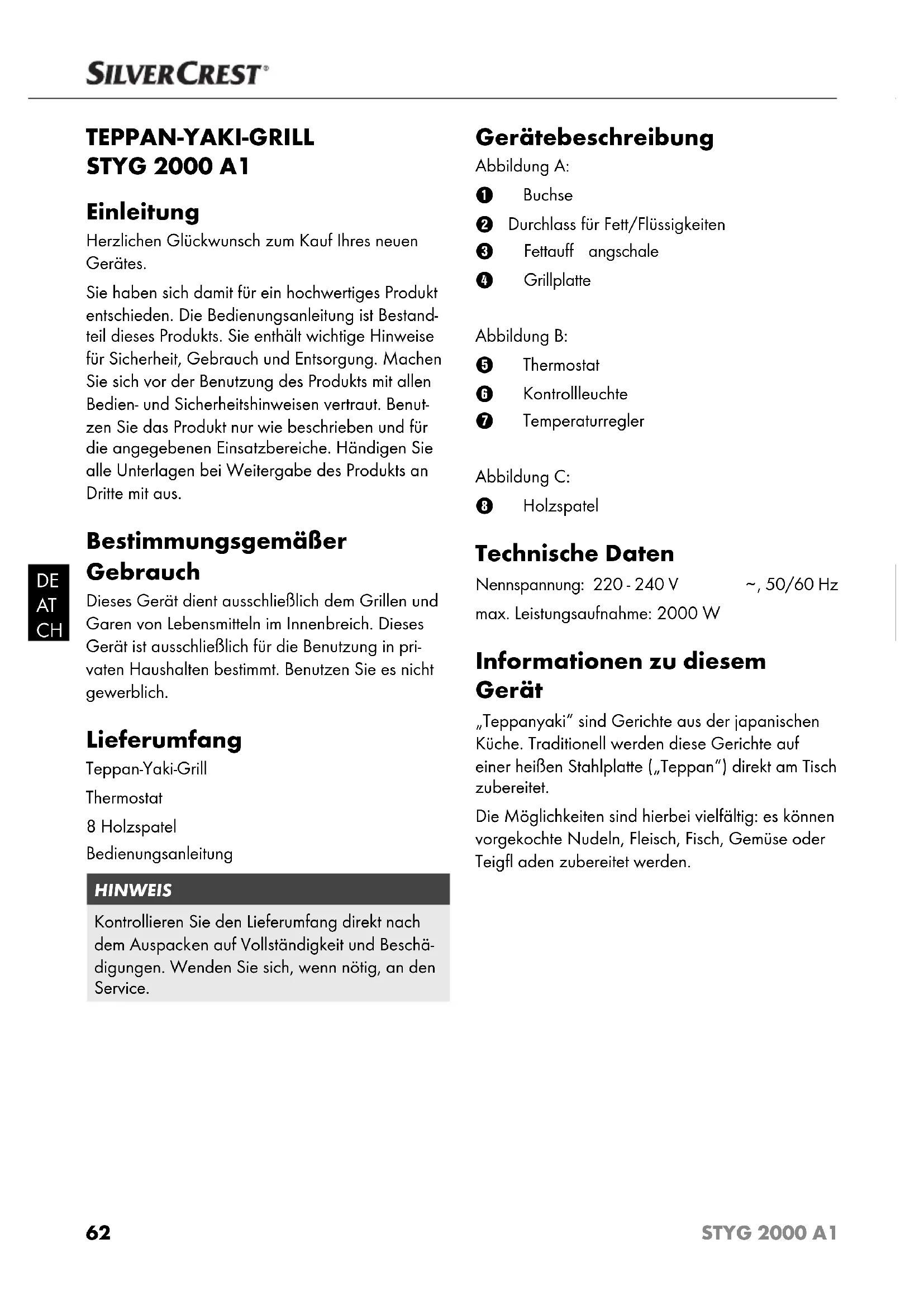 TEPPAN-YAKI-GRILL STYG 2000 A1 Einleitung Herzlichen Glückwunsch zum Kauf Ihres neuen Gerätes. Sie haben sich damit für ein hochwertiges Produkt entschieden. Die Bedienungsanleitung ist Bestand- teil dieses Produkts. Sie enthält wichtige Hinweise für Sicherheit, Gebrauch und Entsorgung. Machen Sie sich vor der Benutzung des Produkts mit allen Bedien- und Sicherheitshinweisen vertraut. Benut- zen Sie das Produkt nur wie beschrieben und für die angegebenen Einsatzbereiche. Händigen Sie alle Unterlagen bei Weitergabe des Produkts an Dritte mit aus. Bestimmungsgemäßer Gebrauch Dieses Gerät dient ausschließlich dem Grillen und Garen von Lebensmitteln im Innenbreich. Dieses Gerät ist ausschließlich für die Benutzung in pri- vaten Haushalten bestimmt. Benutzen Sie es nicht gewerblich. Lieferumfang Teppan-Yaki-Grill Thermostat 8 Holzspatel Bedienungsanleitung HINWEIS Kontrollieren Sie den Lieferumfang direkt nach dem Auspack en auf Vollständigkeit und Beschä- digungen. Wenden Sie sich, wenn nötig, an den Service. Gerätebeschreibung Abbildung A: 1 Buchse 2 Durchlass für Fett/Flüssigkeiten 3 Fettauff angschale 4 Grillplatte Abbildung B: 5 Thermostat 6 Kontrollleuchte 7 Temperaturregler Abbildung C: 8 Holzspatel Technische Daten Nennspannung: 220 - 240 V