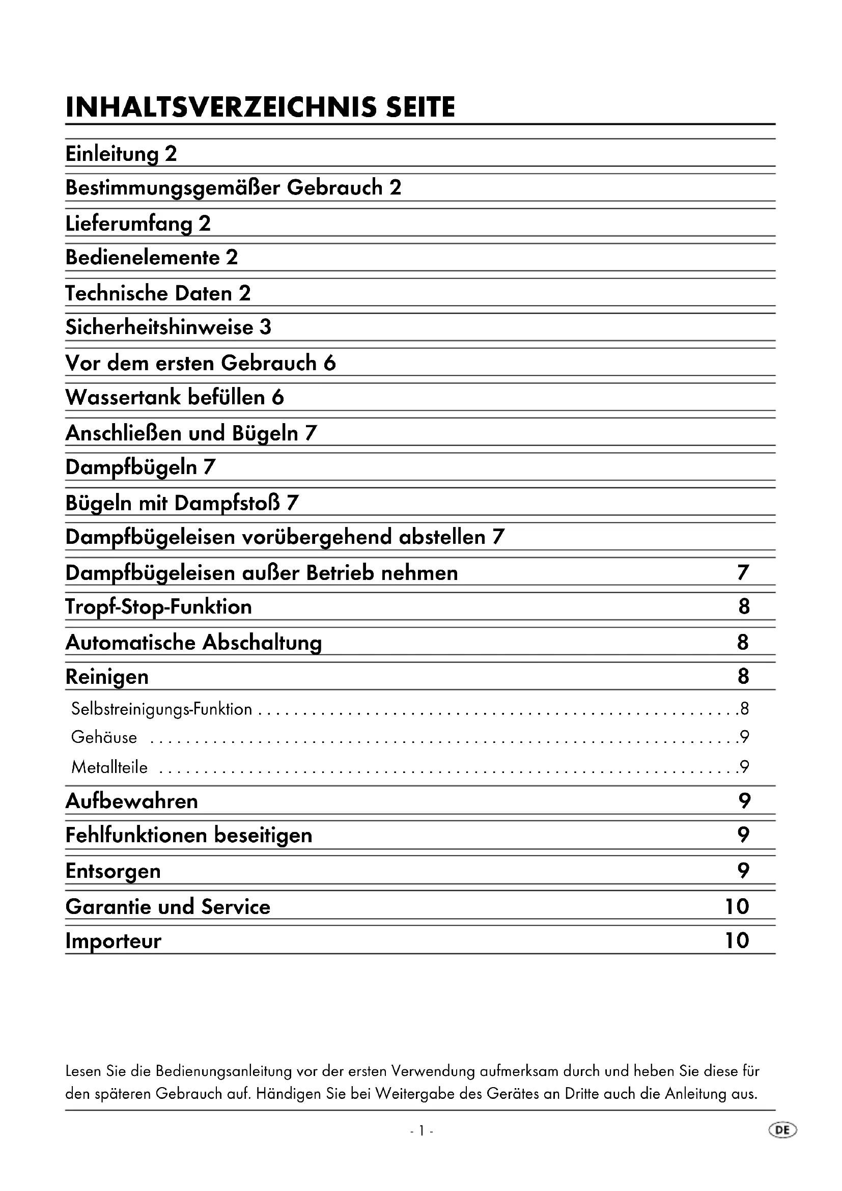 - Mode d’emploi STEAM IRON Operating instructionsDE / AT / CH Bedienungsanleitung Seite 1 FR / CH Mode d’emploi Page 11 IT / CH Istruzioni per l’uso Pagina 21 GB Operating instructions Page 31 Klappen Sie vor dem Lesen die Seite mit den Abbildungen aus und machen Sie sich anschließend mit allen Funktionen des Gerätes vertraut. Avant de lire le mode d‘emploi, ouvrez la page contenant les illustrations et familiarisez-vous ensuite avec toutes les fonctions de l‘appareil. Prima di leggere aprire la pagina con le immagini e prendere confi denza con le diverse funzioni dell’apparecchio. Before reading, unfold the page containing the illustrations and familiarise yourself with all functions of the device.- 1 - INHALTSVERZEICHNIS SEITE Einleitung 2 Bestimmungsgemäßer Gebrauch 2 Lieferumfang 2 Bedienelemente 2 Technische Daten 2 Sicherheitshinweise 3 Vor dem ersten Gebrauch 6 Wassertank befüllen 6 Anschließen und Bügeln 7 Dampfbügeln 7 Bügeln mit Dampfstoß 7 Dampfbügeleisen vorübergehend abstellen 7 Dampfbügeleisen außer Betrieb nehmen 7 Tropf-Stop-Funktion 8 Automatische Abschaltung 8 Reinigen 8 Selbstreinigungs-Funktion p. 8