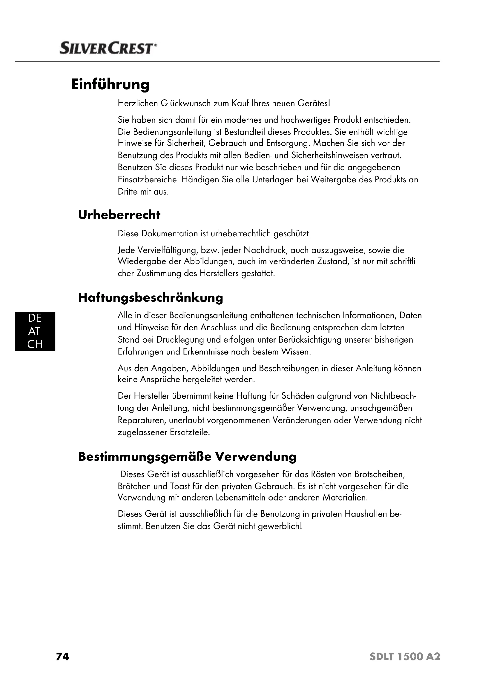 Einführung Herzlichen Glückwunsch zum Kauf Ihres neuen Gerätes! Sie haben sich damit für ein modernes und hochwertiges Produkt entschieden. Die Bedienungsanleitung ist Bestandteil dieses Produktes. Sie enthält wichtige Hinweise für Sicherheit, Gebrauch und Entsorgung. Machen Sie sich vor der Benutzung des Produkts mit allen Bedien- und Sicherheitshinweisen vertraut. Benutzen Sie dieses Produkt nur wie beschrieben und für die angegebenen Einsatzbereiche. Händigen Sie alle Unterlagen bei Weitergabe des Produkts an Dritte mit aus. Urheberrecht Diese Dokumentation ist urheberrechtlich geschützt. Jede Vervielfältigung, bzw. jeder Nachdruck, auch auszugsweise, sowie die Wiedergabe der Abbildungen, auch im veränderten Zustand, ist nur mit schriftli- cher Zustimmung des Herstellers gestattet. Haftungsbeschränkung Alle in dieser Bedienungsanleitung enthaltenen technischen Informationen, Daten und Hinweise für den Anschluss und die Bedienung entsprechen dem letzten Stand bei Drucklegung und erfolgen unter Berücksichtigung unserer bisherigen Erfahrungen und Erkenntnisse nach bestem Wissen. Aus den Angaben, Abbildungen und Beschreibungen in dieser Anleitung können keine Ansprüche hergeleitet werden. Der Hersteller übernimmt keine Haftung für Schäden aufgrund von Nichtbeach- tung der Anleitung, nicht bestimmungsgemäßer Verwendung, unsachgemäßen Reparaturen, unerlaubt vorgenommenen Veränderungen oder Verwendung nicht zugelassener Ersatzteile. Bestimmungsgemäße Verwendung Dieses Gerät ist ausschließlich vorgesehen für das Rösten von Brotscheiben, Brötchen und Toast für den privaten Gebrauch. Es ist nicht vorgesehen für die Verwendung mit anderen Lebensmitteln oder anderen Materialien. Dieses Gerät ist ausschließlich für die Benutzung in privaten Haushalten be- stimmt. Benutzen Sie das Gerät nicht gewerblich! IB_270660_SDLT1500A2_FI_DK_BE.indb 74IB_270660_SDLT1500A2_FI_DK_BE.indb 74 25.08.15 17:1825.08.15 17:1875 SDLT 1500 A2