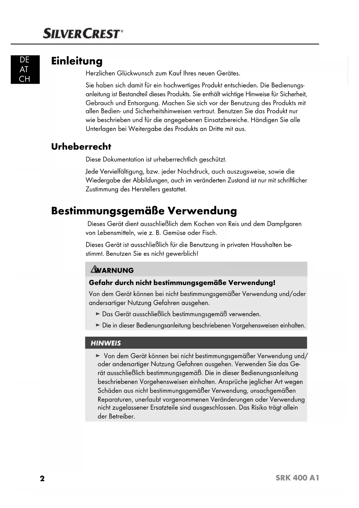 Einleitung Herzlichen Glückwunsch zum Kauf Ihres neuen Gerätes. Sie haben sich damit für ein hochwertiges Produkt entschieden. Die Bedienungs- anleitung ist Bestandteil dieses Produkts. Sie enthält wichtige Hinweise für Sicherheit, Gebrauch und Entsorgung. Machen Sie sich vor der Benutzung des Produkts mit allen Bedien- und Sicherheitshinweisen vertraut. Benutzen Sie das Produkt nur wie beschrieben und für die angegebenen Einsatzbereiche. Händigen Sie alle Unterlagen bei Weitergabe des Produkts an Dritte mit aus. Urheberrecht Diese Dokumentation ist urheberrechtlich geschützt. Jede Vervielfältigung, bzw. jeder Nachdruck, auch auszugsweise, sowie die Wiedergabe der Abbildungen, auch im veränderten Zustand ist nur mit schriftlicher Zustimmung des Herstellers gestattet. Bestimmungsgemäße Verwendung Dieses Gerät dient ausschließlich dem Kochen von Reis und dem Dampfgaren von Lebensmitteln, wie z. B. Gemüse oder Fisch. Dieses Gerät ist ausschließlich für die Benutzung in privaten Haushalten be- stimmt. Benutzen Sie es nicht gewerblich! WARNUNG Gefahr durch nicht bestimmungsgemäße Verwendung! Von dem Gerät können bei nicht bestimmungsgemäßer Verwendung und/oder andersartiger Nutzung Gefahren ausgehen. ► Das Gerät ausschließlich bestimmungsgemäß verwenden. ► Die in dieser Bedienungsanleitung beschriebenen Vorgehensweisen einhalten. HINWEIS ► Von dem Gerät können bei nicht bestimmungsgemäßer Verwendung und/ oder ander sartiger Nutzung Gefahren ausgehen. Verwenden Sie das Ge- rät ausschließlich bestimmungsgemäß. Die in dieser Bedienungsanleitung beschriebenen Vorgehensweisen einhalten. Ansprüche jeglicher Art wegen Schäden aus nicht bestimmungsgemäßer Verwendung, unsachgemäßen Reparaturen, unerlaubt vorgenommenen Veränderungen oder Verwendung nicht zugelassener Ersatzteile sind ausgeschlossen. Das Risiko trägt allein der Betreiber.3 SRK 400 A1