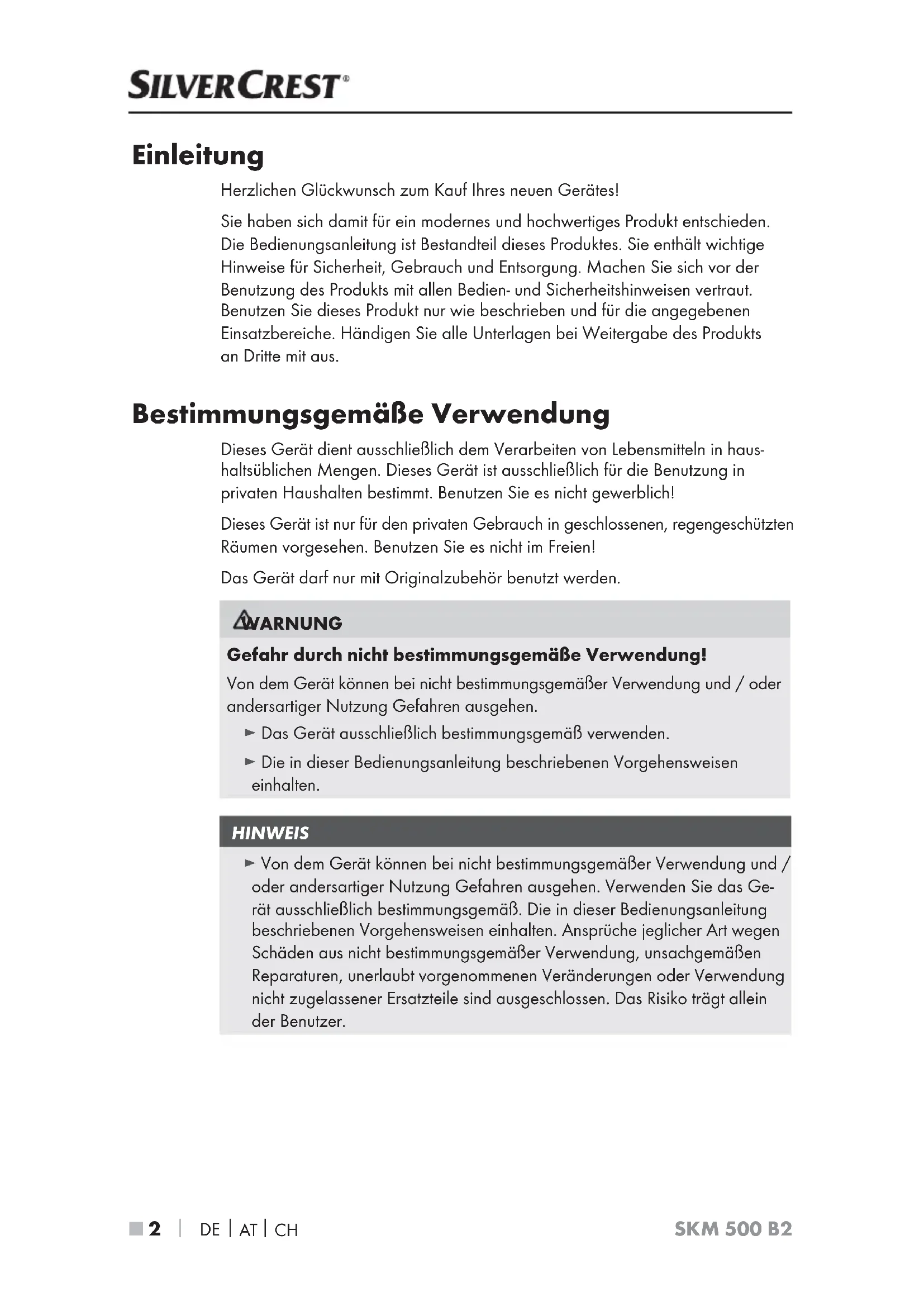 SKM 500 B2 Einleitung Herzlichen Glückwunsch zum Kauf Ihres neuen Gerätes! Sie haben sich damit für ein modernes und hochwertiges Produkt entschieden. Die Bedienungsanleitung ist Bestandteil dieses Produktes. Sie enthält wichtige Hinweise für Sicherheit, Gebrauch und Entsorgung. Machen Sie sich vor der Benutzung des Produkts mit allen Bedien- und Sicherheitshinweisen vertraut. Benutzen Sie dieses Produkt nur wie beschrieben und für die angegebenen Einsatzbereiche. Händigen Sie alle Unterlagen bei Weitergabe des Produkts an Dritte mit aus. Bestimmungsgemäße Verwendung Dieses Gerät dient ausschließlich dem Verarbeiten von Lebensmitteln in haus- haltsüblichen Mengen. Dieses Gerät ist ausschließlich für die Benutzung in privaten Haushalten bestimmt. Benutzen Sie es nicht gewerblich! Dieses Gerät ist nur für den privaten Gebrauch in geschlossenen, regengeschützten Räumen vorgesehen. Benutzen Sie es nicht im Freien! Das Gerät darf nur mit Originalzubehör benutzt werden. WARNUNG Gefahr durch nicht bestimmungsgemäße Verwendung! Von dem Gerät können bei nicht bestimmungsgemäßer Verwendung und / oder andersartiger Nutzung Gefahren ausgehen. ► Das Gerät ausschließlich bestimmungsgemäß verwenden. ► Die in dieser Bedienungsanleitung beschriebenen Vorgehensweisen einhalten. HINWEIS ► Von dem Gerät können bei nicht bestimmungsgemäßer Verwendung und / oder andersartiger Nutzung Gefahren ausgehen. Verwenden Sie das Ge- rät ausschließlich bestimmungsgemäß. Die in dieser Bedienungsanleitung beschriebenen Vorgehensweisen einhalten. Ansprüche jeglicher Art wegen Schäden aus nicht bestimmungsgemäßer Verwendung, unsachgemäßen Reparaturen, unerlaubt vorgenommenen Veränderungen oder Verwendung nicht zugelassener Ersatzteile sind ausgeschlossen. Das Risiko trägt allein der Benutzer.DE