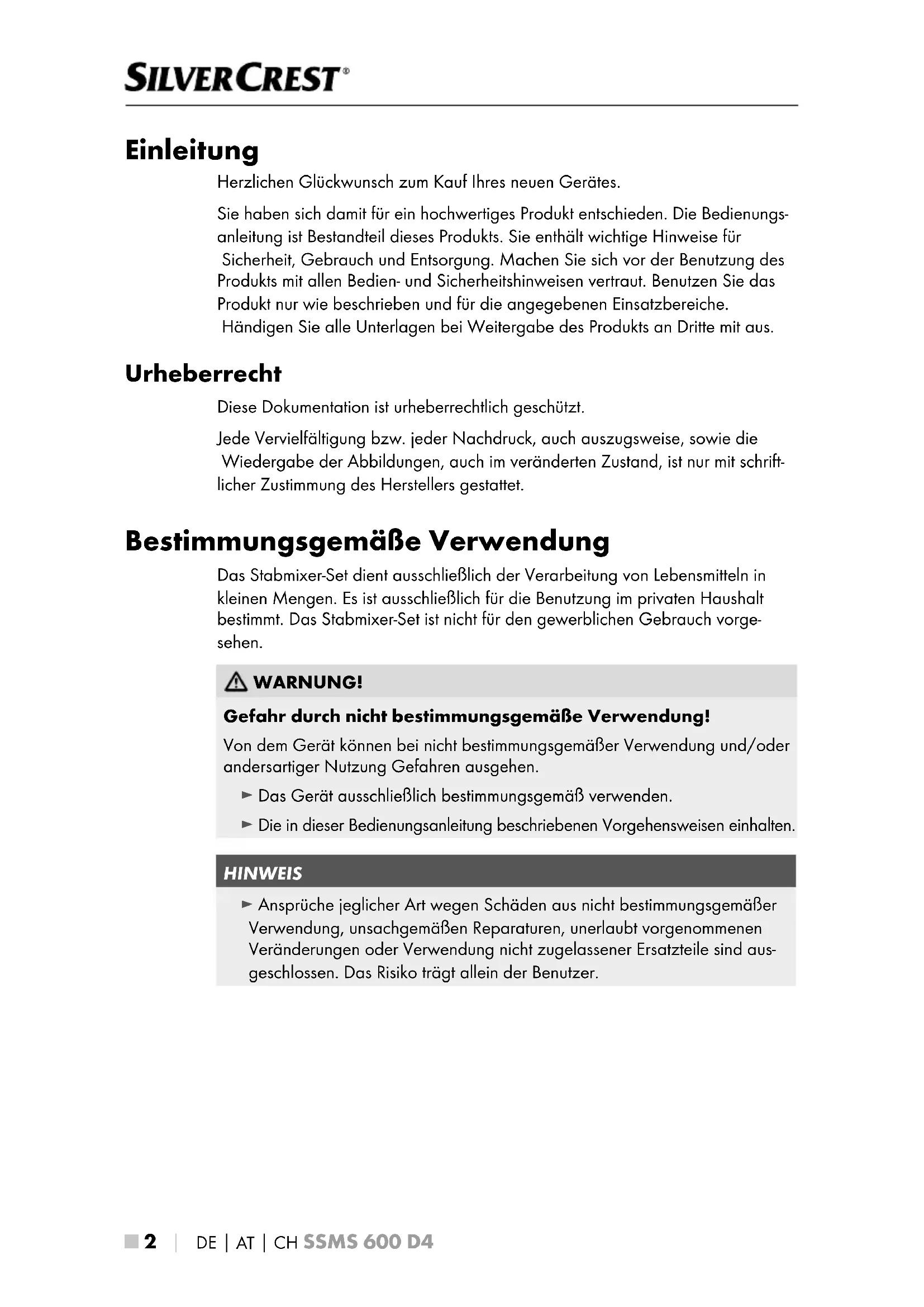 Einleitung Herzlichen Glückwunsch zum Kauf Ihres neuen Gerätes. Sie haben sich damit für ein hochwertiges Produkt entschieden. Die Bedienungs- anleitung ist Bestandteil dieses Produkts. Sie enthält wichtige Hinweise für Sicherheit, Gebrauch und Entsorgung. Machen Sie sich vor der Benutzung des Produkts mit allen Bedien- und Sicherheitshinweisen vertraut. Benutzen Sie das Produkt nur wie beschrieben und für die angegebenen Einsatzbereiche. Händigen Sie alle Unterlagen bei Weitergabe des Produkts an Dritte mit aus. Urheberrecht Diese Dokumentation ist urheberrechtlich geschützt. Jede Vervielfältigung bzw. jeder Nachdruck, auch auszugsweise, sowie die Wiedergabe der Abbildungen, auch im veränderten Zustand, ist nur mit schrift- licher Zustimmung des Herstellers gestattet. Bestimmungsgemäße Verwendung Das Stabmixer-Set dient ausschließlich der Verarbeitung von Lebensmitteln in kleinen Mengen. Es ist ausschließlich für die Benutzung im privaten Haushalt bestimmt. Das Stabmixer-Set ist nicht für den gewerblichen Gebrauch vorge- sehen. WARNUNG! Gefahr durch nicht bestimmungsgemäße Verwendung! Von dem Gerät können bei nicht bestimmungsgemäßer Verwendung und/oder andersartiger Nutzung Gefahren ausgehen. ► Das Gerät ausschließlich bestimmungsgemäß verwenden. ► Die in dieser Bedienungsanleitung beschriebenen Vorgehensweisen einhalten. HINWEIS ► Ansprüche jeglicher Art wegen Schäden aus nicht bestimmungsgemäßer Verwendung, unsachgemäßen Reparaturen, unerlaubt vorgenommenen Veränderungen oder Verwendung nicht zugelassener Ersatzteile sind aus- geschlossen. Das Risiko trägt allein der Benutzer.DE