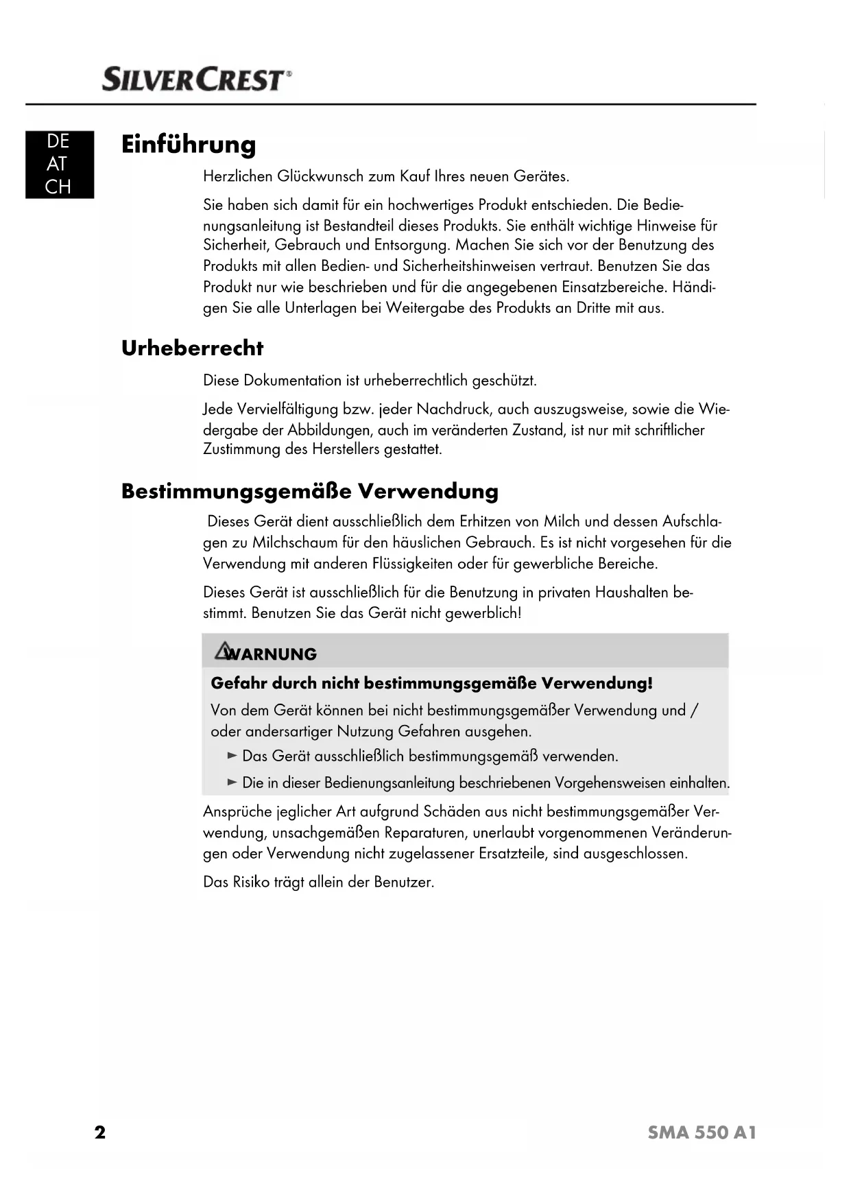 Einführung Herzlichen Glückwunsch zum Kauf Ihres neuen Gerätes. Sie haben sich damit für ein hochwertiges Produkt entschieden. Die Bedie- nungsanleitung ist Bestandteil dieses Produkts. Sie enthält wichtige Hinweise für Sicherheit, Gebrauch und Entsorgung. Machen Sie sich vor der Benutzung des Produkts mit allen Bedien- und Sicherheitshinweisen vertraut. Benutzen Sie das Produkt nur wie beschrieben und für die angegebenen Einsatzbereiche. Händi- gen Sie alle Unterlagen bei Weitergabe des Produkts an Dritte mit aus. Urheberrecht Diese Dokumentation ist urheberrechtlich geschützt. Jede Vervielfältigung bzw. jeder Nachdruck, auch auszugsweise, sowie die Wie- dergabe der Abbildungen, auch im veränderten Zustand, ist nur mit schriftlicher Zustimmung des Herstellers gestattet. Bestimmungsgemäße Verwendung Dieses Gerät dient ausschließlich dem Erhitzen von Milch und dessen Aufschla- gen zu Milchschaum für den häuslichen Gebrauch. Es ist nicht vorgesehen für die Verwendung mit anderen Flüssigkeiten oder für gewerbliche Bereiche. Dieses Gerät ist ausschließlich für die Benutzung in privaten Haushalten be- stimmt. Benutzen Sie das Gerät nicht gewerblich! WARNUNG Gefahr durch nicht bestimmungsgemäße Verwendung! Von dem Gerät können bei nicht bestimmungsgemäßer Verwendung und / oder andersartiger Nutzung Gefahren ausgehen. ► Das Gerät ausschließlich bestimmungsgemäß verwenden. ► Die in dieser Bedienungsanleitung beschriebenen Vorgehensweisen einhalten. Ansprüche jeglicher Ar t aufgrund Schäden aus nicht bestimmungsgemäßer Ver- wendung, unsachgemäßen Reparaturen, unerlaubt vorgenommenen Veränderun- gen oder Verwendung nicht zugelassener Ersatzteile, sind ausgeschlossen. Das Risiko trägt allein der Benutzer.3 SMA 550 A1