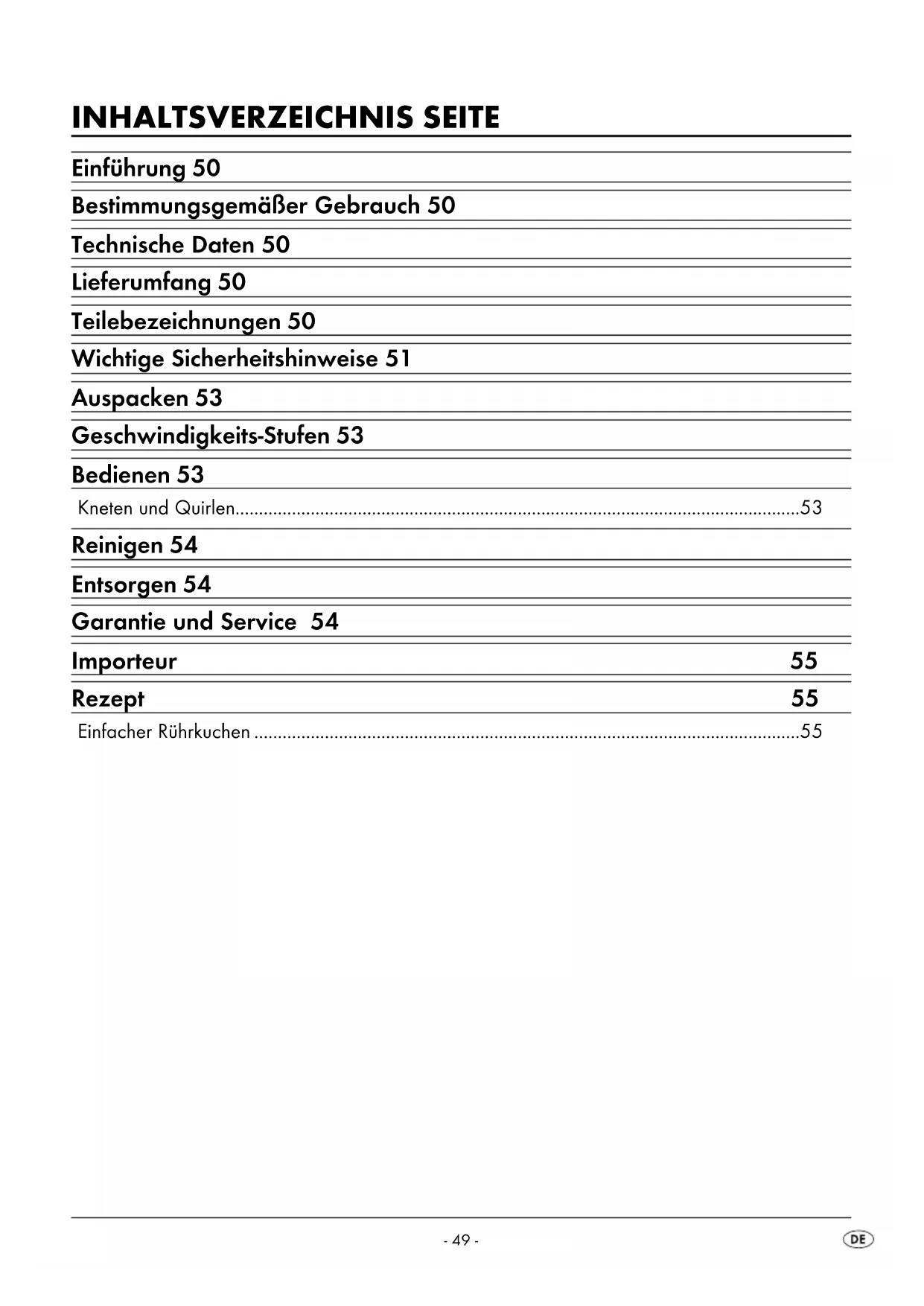- lucht en bak de cake ca. 40 - 45 minuten.- 48 -- 49 - INHALTSVERZEICHNIS SEITE Einführung 50 Bestimmungsgemäßer Gebrauch 50 Technische Daten 50 Lieferumfang 50 Teilebezeichnungen 50 Wichtige Sicherheitshinweise 51 Auspacken 53 Geschwindigkeits-Stufen 53 Bedienen 53 Kneten und Quirlen p. 53