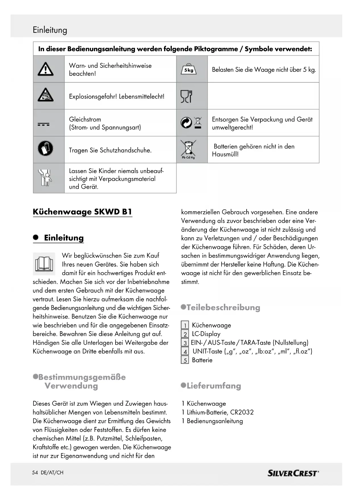(ma. – fr.: 8–18 klok) service-nl@mgg-elektro.de 0800 70 611 (ma. – fr.: 8–18 klok) service-be@mgg-elektro.de Als wij u vragen, het defecte product op te sturen, kunt u het naar volgend adres opsturen: NU Service GmbH Lessingstraße 10 b 89231 Neu-Ulm Duitsland IAN 270659 Conformiteitsverklaring Deze keukenweegschaal voldoet aan de eisen van de van toepassing zijnde Europese en nationale richtlijnen. Dit wordt bevestigd door het CE-keurmerk. Desbetreffende verklaringen liggen ter inzage bij de fabrikant.5253 DE/AT/CH Inhaltsverzeichnis Einleitung Bestimmungsgemäße Verwendung ....................................................................................................Seite 54 Teilebeschreibung ...............................................................................................................................Seite 54 Lieferumfang ........................................................................................................................................ Seite 54 Technische Daten ................................................................................................................................Seite 55 Allgemeine Sicherheitshinweise ..................................................................................Seite 55 Sicherheitshinweise zu Batterien ................................................................................ Seite 56 Inbetriebnahme ......................................................................................................................... Seite 57 Batterie wechseln .....................................................................................................................Seite 57 Bedienung Einheit einstellen .................................................................................................................................. Seite 58 Wiegen ................................................................................................................................................ Seite 58 Zuwiegen ............................................................................................................................................. Seite 58 Küchenwaage ausschalten .................................................................................................................Seite 58 Fehler beheben ..........................................................................................................................Seite 58 Reinigung und Pflege ............................................................................................................Seite 59 Entsorgung .....................................................................................................................................Seite 59 Garantie / Service .....................................................................................................................Seite 59 Konformitätserklärung .......................................................................................................Seite 6054 DE/AT/CH Einleitung Küchenwaage SKWD B1 Einleitung Wir beglückwünschen Sie zum Kauf Ihres neuen Gerätes. Sie haben sich damit für ein hochwertiges Produkt ent- schieden. Machen Sie sich vor der Inbetriebnahme und dem ersten Gebrauch mit der Küchenwaage vertraut. Lesen Sie hierzu aufmerksam die nachfol- gende Bedienungsanleitung und die wichtigen Sicher- heitshinweise. Benutzen Sie die Küchenwaage nur wie beschrieben und für die angegebenen Einsatz- bereiche. Bewahren Sie diese Anleitung gut auf. Händigen Sie alle Unterlagen bei Weitergabe der Küchenwaage an Dritte ebenfalls mit aus. Bestimmungsgemäße Verwendung Dieses Gerät ist zum Wiegen und Zuwiegen haus- haltsüblicher Mengen von Lebensmitteln bestimmt. Die Küchenwaage dient zur Ermittlung des Gewichts von Flüssigkeiten oder Feststoffen. Es dürfen keine chemischen Mittel (z.B. Putzmittel, Schleifpasten, Kraftstoffe etc.) gewogen werden. Die Küchenwaage ist nur zur Eigenanwendung und nicht für den kommerziellen Gebrauch vorgesehen. Eine andere Verwendung als zuvor beschrieben oder eine Ver- änderung der Küchenwaage ist nicht zulässig und kann zu Verletzungen und / oder Beschädigungen der Küchenwaage führen. Für Schäden, deren Ur- sachen in bestimmungswidriger Anwendung liegen, übernimmt der Hersteller keine Haftung. Die Küchen- waage ist nicht für den gewerblichen Einsatz be- stimmt. Teilebeschreibung
