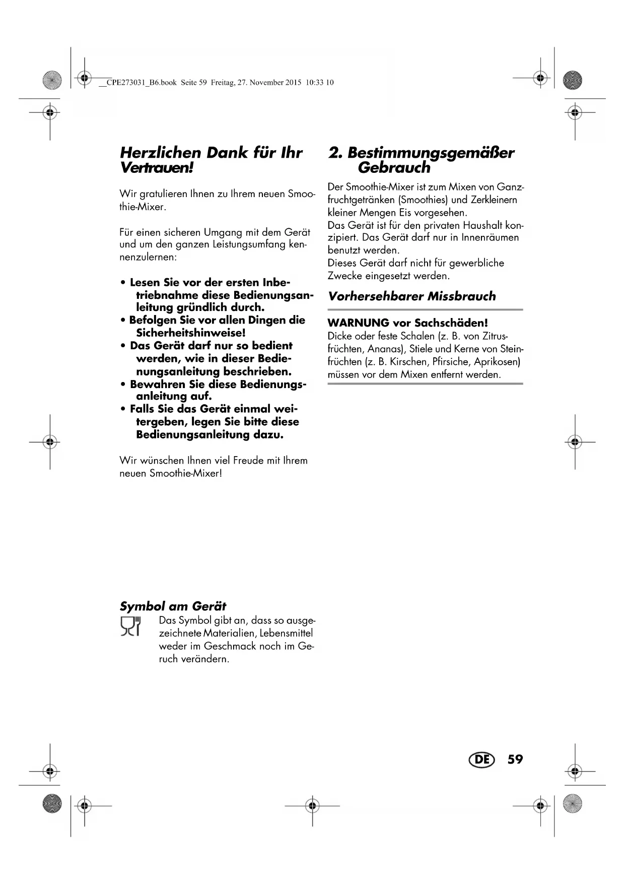 Gebrauch Der Smoothie-Mixer ist zum Mixen von Ganz- fruchtgetränken (Smoothies) und Zerkleinern kleiner Mengen Eis vorgesehen. Das Gerät ist für den privaten Haushalt kon- zipiert. Das Gerät darf nur in Innenräumen benutzt werden. Dieses Gerät darf nicht für gewerbliche Zwecke eingesetzt werden. Vorhersehbarer Missbrauch WARNUNG vor Sachschäden! Dicke oder feste Schalen (z. B. von Zitrus- früchten, Ananas), Stiele und Kerne von Stein- früchten (z. B. Kirschen, Pfirsiche, Aprikosen) müssen vor dem Mixen entfernt werden.