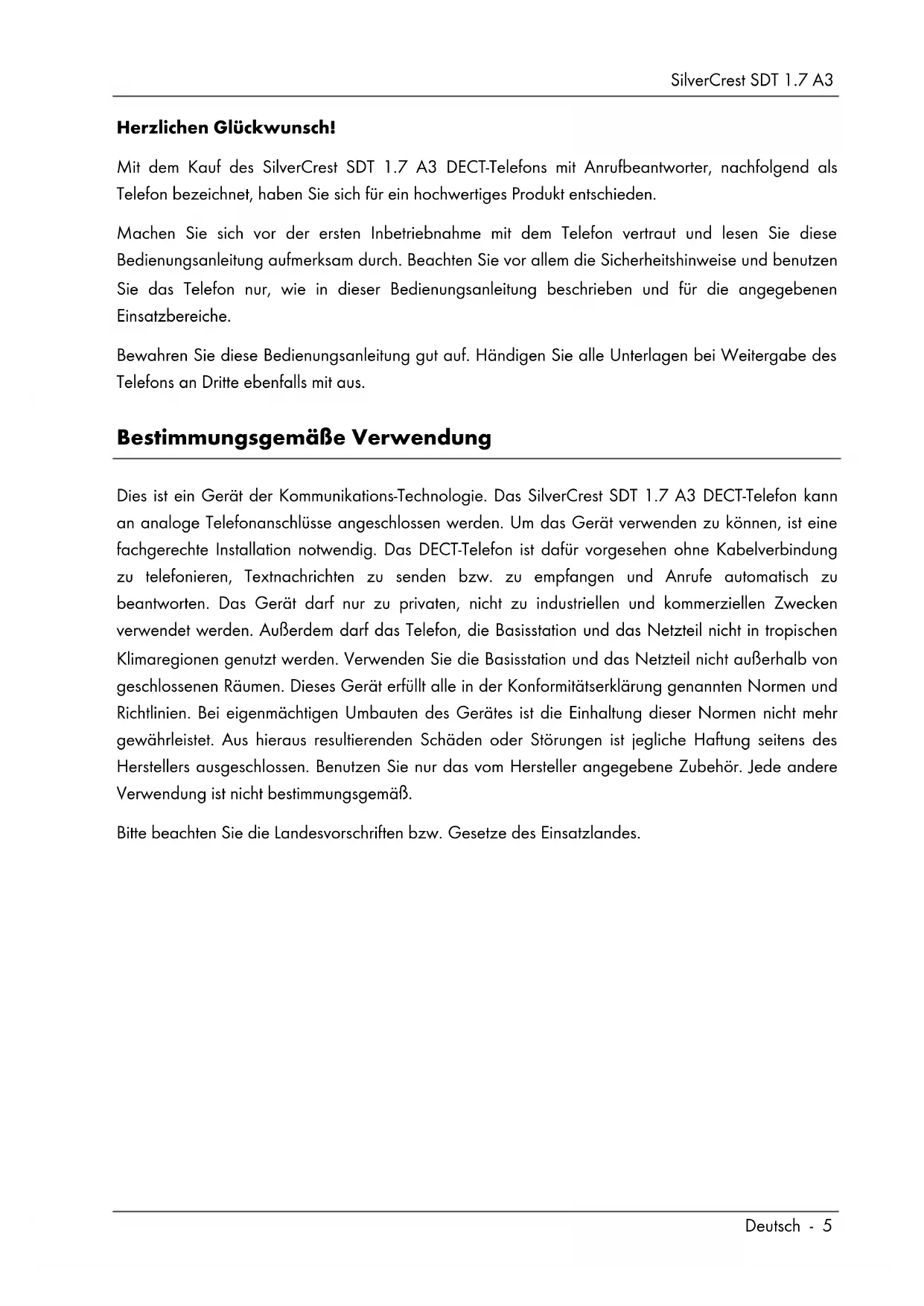 Machen Sie sich vor der ersten Inbetriebnahme mit dem Telefon vertraut und lesen Sie diese Bedienungsanleitung aufmerksam durch. Beachten Sie vor allem die Sicherheitshinweise und benutzen Sie das Telefon nur, wie in dieser Bedienungsanleitung beschrieben und für die angegebenen Einsatzbereiche. Bewahren Sie diese Bedienungsanleitung gut auf. Händigen Sie alle Unterlagen bei Weitergabe des Telefons an Dritte ebenfalls mit aus. Bestimmungsgemäße Verwendung Dies ist ein Gerät der Kommunikations-Technologie. Das SilverCrest SDT 1.7 A3 DECT-Telefon kann an analoge Telefonanschlüsse angeschlossen werden. Um das Gerät verwenden zu können, ist eine fachgerechte Installation notwendig. Das DECT-Telefon ist dafür vorgesehen ohne Kabelverbindung zu telefonieren, Textnachrichten zu senden bzw. zu empfangen und Anrufe automatisch zu beantworten. Das Gerät darf nur zu privaten, nicht zu industriellen und kommerziellen Zwecken verwendet werden. Außerdem darf das Telefon, die Basisstation und das Netzteil nicht in tropischen Klimaregionen genutzt werden. Verwenden Sie die Basisstation und das Netzteil nicht außerhalb von geschlossenen Räumen. Dieses Gerät erfüllt alle in der Konformitätserklärung genannten Normen und Richtlinien. Bei eigenmächtigen Umbauten des Gerätes ist die Einhaltung dieser Normen nicht mehr gewährleistet. Aus hieraus resultierenden Schäden oder Störungen ist jegliche Haftung seitens des Herstellers ausgeschlossen. Benutzen Sie nur das vom Hersteller angegebene Zubehör. Jede andere Verwendung ist nicht bestimmungsgemäß. Bitte beachten Sie die Landesvorschriften bzw. Gesetze des Einsatzlandes.SilverCrest SDT 1.7 A3