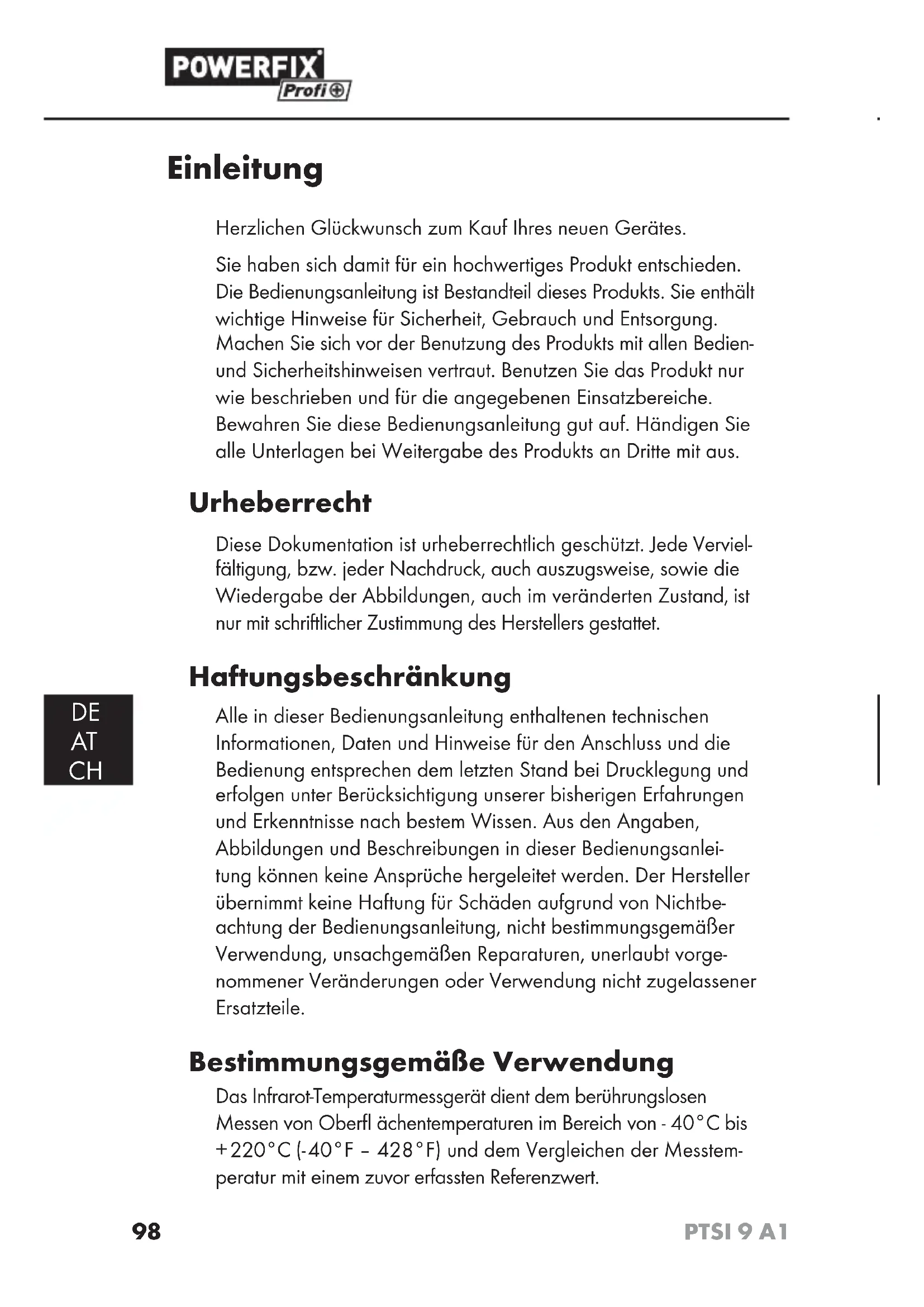 Einleitung Herzlichen Glückwunsch zum Kauf Ihres neuen Gerätes. Sie haben sich damit für ein hochwertiges Produkt entschieden. Die Bedienungsanleitung ist Bestandteil dieses Produkts. Sie enthält wichtige Hinweise für Sicherheit, Gebrauch und Entsorgung. Machen Sie sich vor der Benutzung des Produkts mit allen Bedien- und Sicherheitshinweisen vertraut. Benutzen Sie das Produkt nur wie beschrieben und für die angegebenen Einsatzbereiche. Bewahren Sie diese Bedienungsanleitung gut auf. Händigen Sie alle Unterlagen bei Weitergabe des Produkts an Dritte mit aus. Urheberrecht Diese Dokumentation ist urheberrechtlich geschützt. Jede Verviel- fältigung, bzw. jeder Nachdruck, auch auszugsweise, sowie die Wiedergabe der Abbildungen, auch im veränderten Zustand, ist nur mit schriftlicher Zustimmung des Herstellers gestattet. Haftungsbeschränkung Alle in dieser Bedienungsanleitung enthaltenen technischen Informationen, Daten und Hinweise für den Anschluss und die Bedienung entsprechen dem letzten Stand bei Drucklegung und erfolgen unter Berücksichtigung unserer bisherigen Erfahrungen und Erkenntnisse nach bestem Wissen. Aus den Angaben, Abbildungen und Beschreibungen in dieser Bedienungsanlei- tung können keine Ansprüche hergeleitet werden. Der Hersteller übernimmt keine Haftung für Schäden aufgrund von Nichtbe- achtung der Bedienungsanleitung, nicht bestimmungsgemäßer Verwendung, unsachgemäßen Reparaturen, unerlaubt vorge- nommener Veränderungen oder Verwendung nicht zugelassener Ersatzteile. Bestimmungsgemäße Verwendung Das Infrarot-Temperaturmessgerät dient dem berührungslosen Messen von Oberfl ächentemperaturen im Bereich von - 40°C bis + 220°C (- 40°F – 428°F) und dem Vergleichen der Messtem- peratur mit einem zuvor erfassten Referenzwert. IB_100042_PTSI9A1_LB3.indb 98 12.05.14 14:0899 PTSI 9 A1