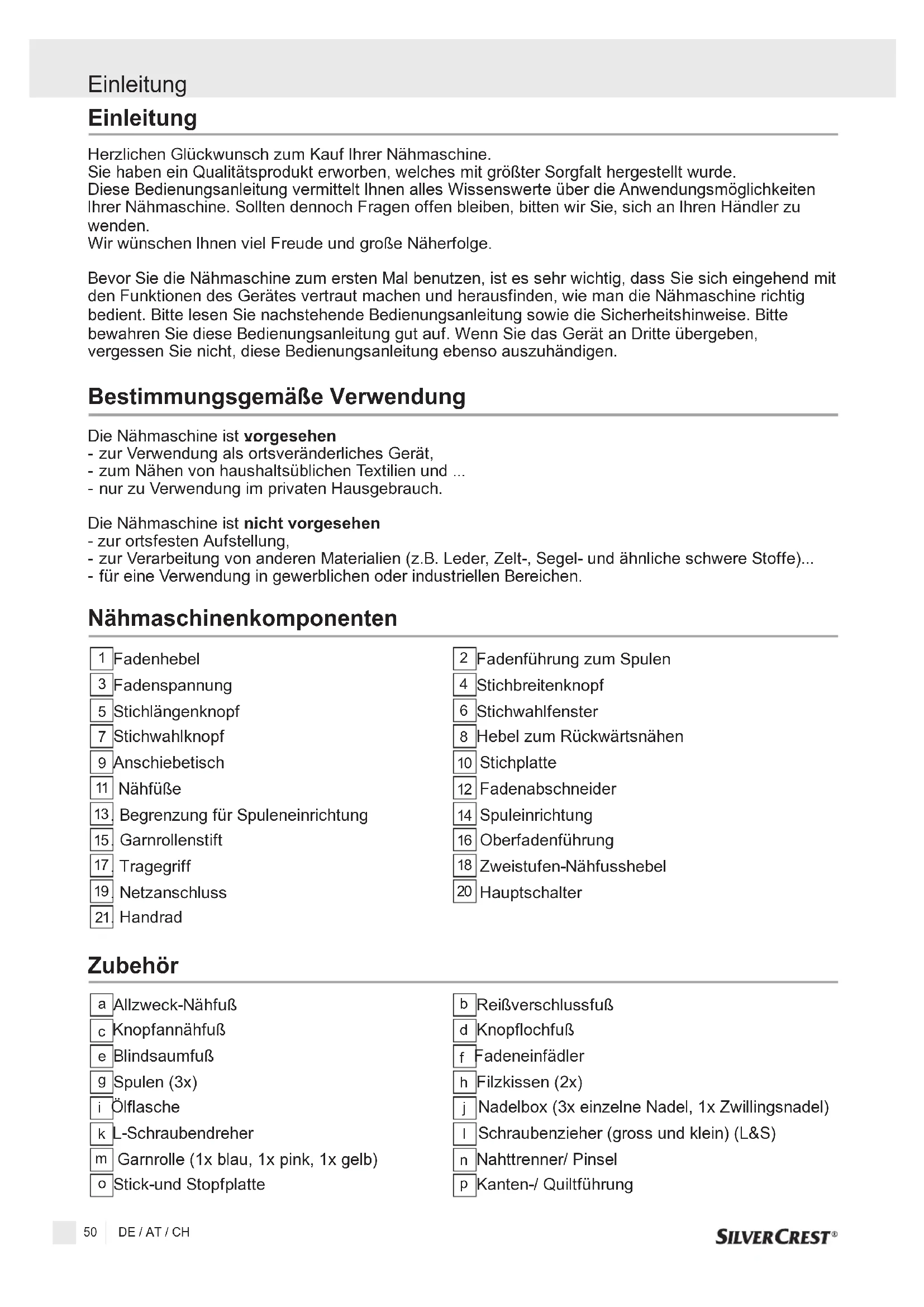 Wichtige Sicherheitshinweise Wartung Garantie Hersteller Nähmaschinenkomponenten Einrichten der Garnspulenstifte Nähen / Nützliche Anwendungen Stretchstich Nähmaschine Vorbereitung Grundlagen des Nähens DE / AT / CH 49 InhaltsverzeichnisNähmaschinenkomponenten a. Allzweck-Nähfuß c. Knopfannähfuß e. Blindsaumfuß g. Spulen (3x)