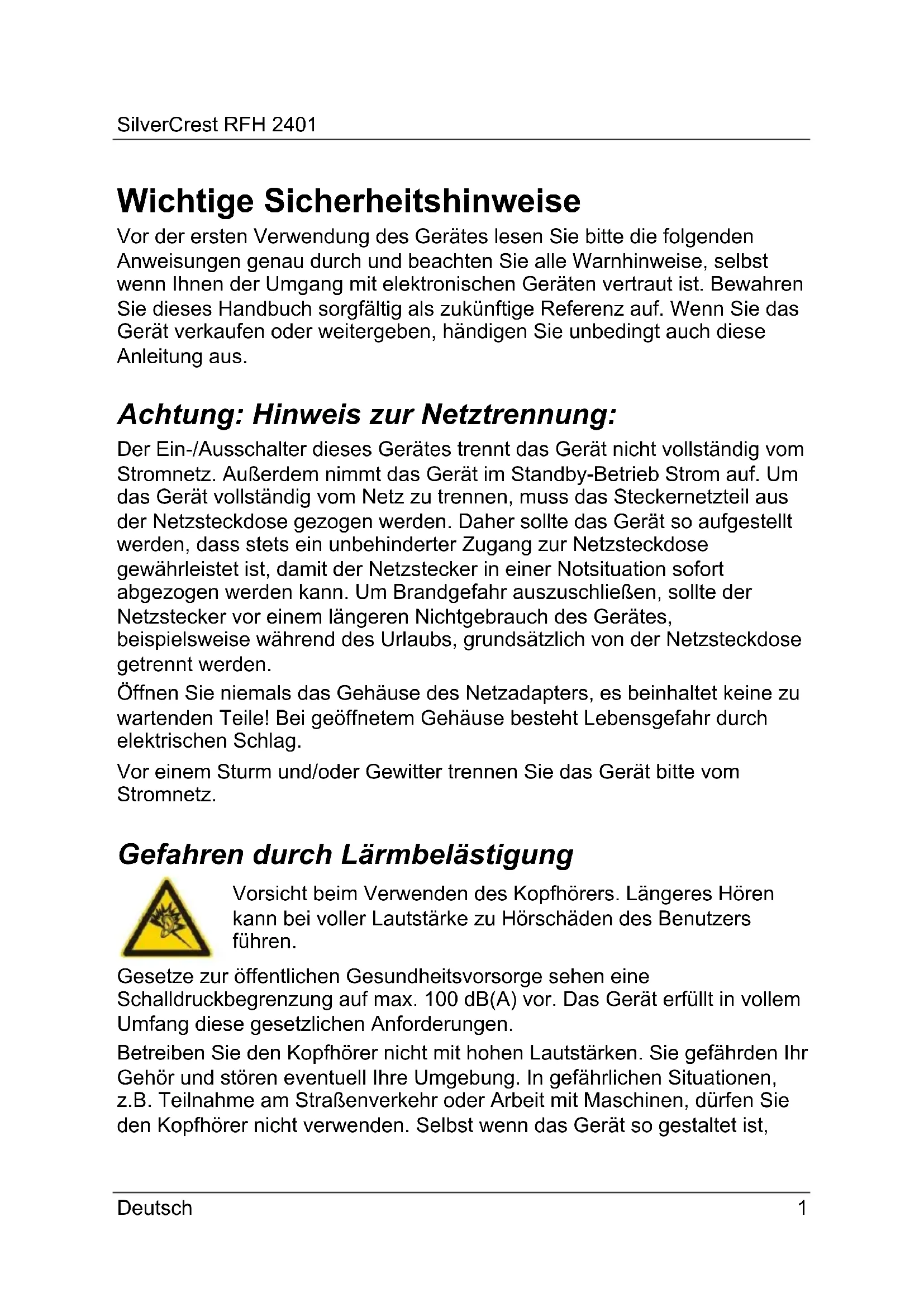 Gebruikershandleiding en service-informatie Mat-No: 1600585SilverCrest RFH 2401 Deutsch 1 Wichtige Sicherheitshinweise Vor der ersten Verwendung des Gerätes lesen Sie bitte die folgenden Anweisungen genau durch und beachten Sie alle Warnhinweise, selbst wenn Ihnen der Umgang mit elektronischen Geräten vertraut ist. Bewahren Sie dieses Handbuch sorgfältig als zukünftige Referenz auf. Wenn Sie das Gerät verkaufen oder weitergeben, händigen Sie unbedingt auch diese Anleitung aus. Achtung: Hinweis zur Netztrennung: Der Ein-/Ausschalter dieses Gerätes trennt das Gerät nicht vollständig vom Stromnetz. Außerdem nimmt das Gerät im Standby-Betrieb Strom auf. Um das Gerät vollständig vom Netz zu trennen, muss das Steckernetzteil aus der Netzsteckdose gezogen werden. Daher sollte das Gerät so aufgestellt werden, dass stets ein unbehinderter Zugang zur Netzsteckdose gewährleistet ist, damit der Netzstecker in einer Notsituation sofort abgezogen werden kann. Um Brandgefahr auszuschließen, sollte der Netzstecker vor einem längeren Nichtgebrauch des Gerätes, beispielsweise während des Urlaubs, grundsätzlich von der Netzsteckdose getrennt werden. Öffnen Sie niemals das Gehäuse des Netzadapters, es beinhaltet keine zu wartenden Teile! Bei geöffnetem Gehäuse besteht Lebensgefahr durch elektrischen Schlag. Vor einem Sturm und/oder Gewitter trennen Sie das Gerät bitte vom Stromnetz. Gefahren durch Lärmbelästigung Vorsicht beim Verwenden des Kopfhörers. Längeres Hören kann bei voller Lautstärke zu Hörschäden des Benutzers führen. Gesetze zur öffentlichen Gesundheitsvorsorge sehen eine Schalldruckbegrenzung auf max. 100 dB(A) vor. Das Gerät erfüllt in vollem Umfang diese gesetzlichen Anforderungen. Betreiben Sie den Kopfhörer nicht mit hohen Lautstärken. Sie gefährden Ihr Gehör und stören eventuell Ihre Umgebung. In gefährlichen Situationen, z.B. Teilnahme am Straßenverkehr oder Arbeit mit Maschinen, dürfen Sie den Kopfhörer nicht verwenden. Selbst wenn das Gerät so gestaltet ist,SilverCrest RFH 2401 2 Deutsch dass es die Wahrnehmung von Außengeräuschen gewährleistet, stellen Sie die Lautstärke nicht so hoch ein, dass Sie nicht mehr hören, was um Sie herum geschieht. Betriebsumgebung Stellen Sie das Gerät auf eine feste, ebene Oberfläche und stellen Sie keine Gegenstände auf das Gerät. Das Gerät ist nicht für den Betrieb in Räumen mit hoher Temperatur oder Luftfeuchtigkeit (z.B. Badezimmer) oder übermäßigem Staubaufkommen ausgelegt. Betriebstemperatur und Betriebsluftfeuchtigkeit: 5 °C bis 40 °C, max. 90% rel. Feuchte Achten Sie darauf, dass: