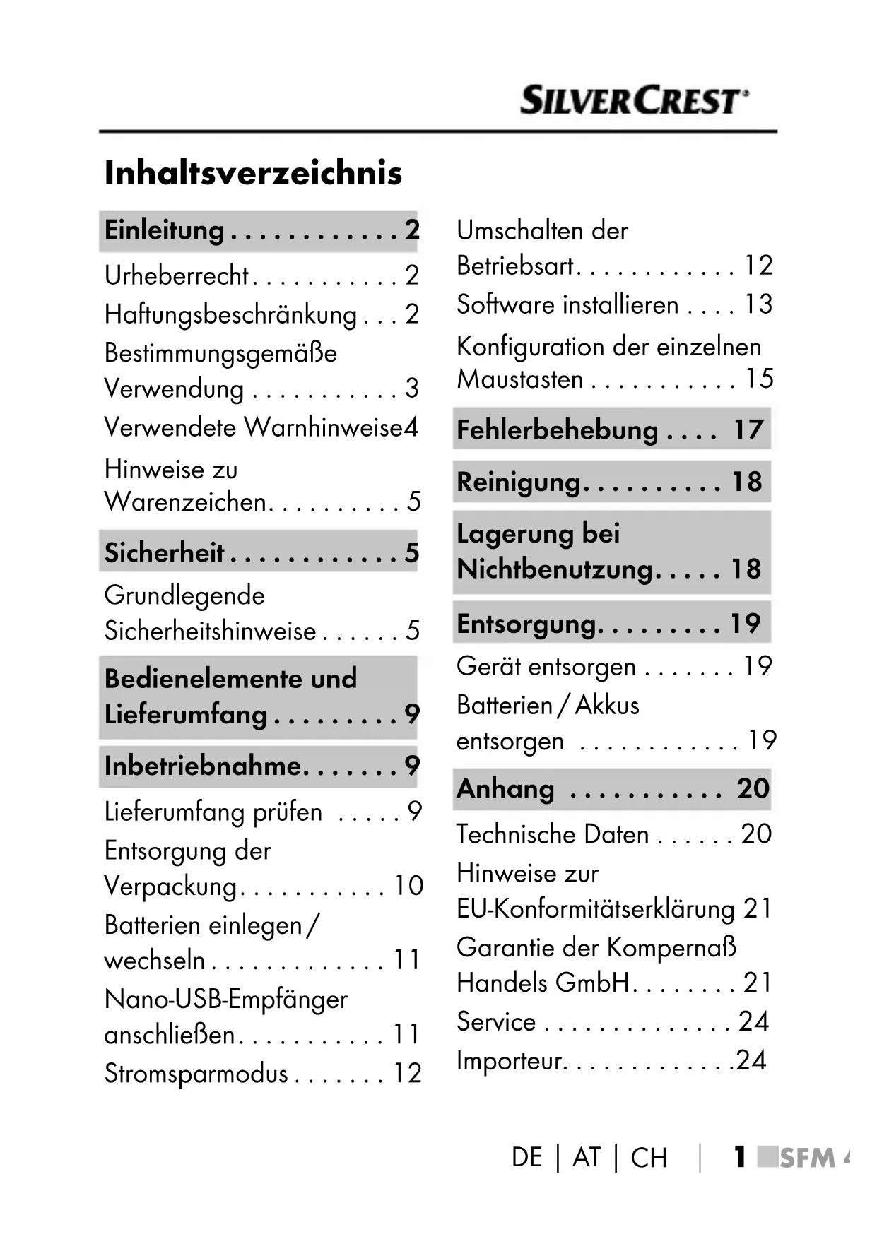 3 ■SFM 4 A1 Aus den Angaben, Abbildungen und Beschreibungen in dieser Bedienungsanleitung können keine Ansprüche hergeleitet werden. Der Hersteller übernimmt keine Haftung für Schäden aufgrund von Nichtbeachtung der Bedienungsanleitung, nicht bestimmungsgemäßer Verwendung, unsachgemäßen Reparaturen, unerlaubt vorgenommenen Veränderungen oder Verwendung nicht zugelassener Ersatzteile. Bestimmungsgemäße Verwendung Diese Funkmaus ist ein Gerät der Informationstechnik und dient als Eingabegerät für einen Computer. Das Gerät darf nicht außerhalb von geschlossenen Räumen genutzt werden. Dieses Gerät ist nicht für den Betrieb in Unternehmen und den gewerblichen Einsatz vorge- sehen (z.B. Büroanwendungen). Verwenden Sie das Gerät ausschließlich im Wohnbereich für den privaten Gebrauch. Eine andere oder darüber hinausgehende Benutzung gilt als nicht bestimmungsgemäß. Ansprüche jeglicher Art wegen Schäden aus nicht bestimmungsge- mäßer Verwendung sind ausgeschlossen. Das Risiko trägt allein der Benutzer.■ 4