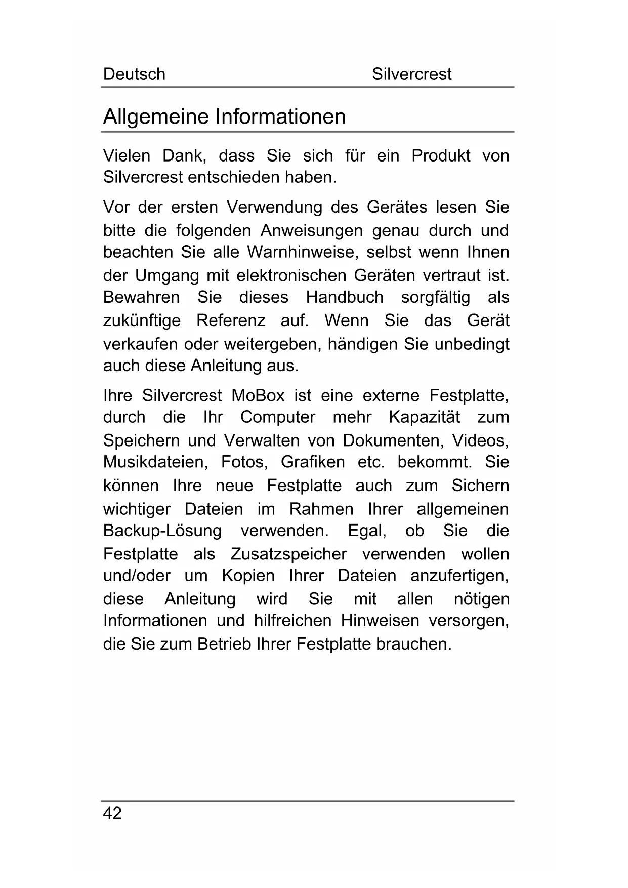 Allgemeine Informationen Vielen Dank, dass Sie sich für ein Produkt von Silvercrest entschieden haben. Vor der ersten Verwendung des Gerätes lesen Sie bitte die folgenden Anweisungen genau durch und beachten Sie alle Warnhinweise, selbst wenn Ihnen der Umgang mit elektronischen Geräten vertraut ist. Bewahren Sie dieses Handbuch sorgfältig als zukünftige Referenz auf. Wenn Sie das Gerät verkaufen oder weitergeben, händigen Sie unbedingt auch diese Anleitung aus. Ihre Silvercrest MoBox ist eine externe Festplatte, durch die Ihr Computer mehr Kapazität zum Speichern und Verwalten von Dokumenten, Videos, Musikdateien, Fotos, Grafiken etc. bekommt. Sie können Ihre neue Festplatte auch zum Sichern wichtiger Dateien im Rahmen Ihrer allgemeinen Backup-Lösung verwenden. Egal, ob Sie die Festplatte als Zusatzspeicher verwenden wollen und/oder um Kopien Ihrer Dateien anzufertigen, diese Anleitung wird Sie mit allen nötigen Informationen und hilfreichen Hinweisen versorgen, die Sie zum Betrieb Ihrer Festplatte brauchen.Silvercrest MoBox Deutsch