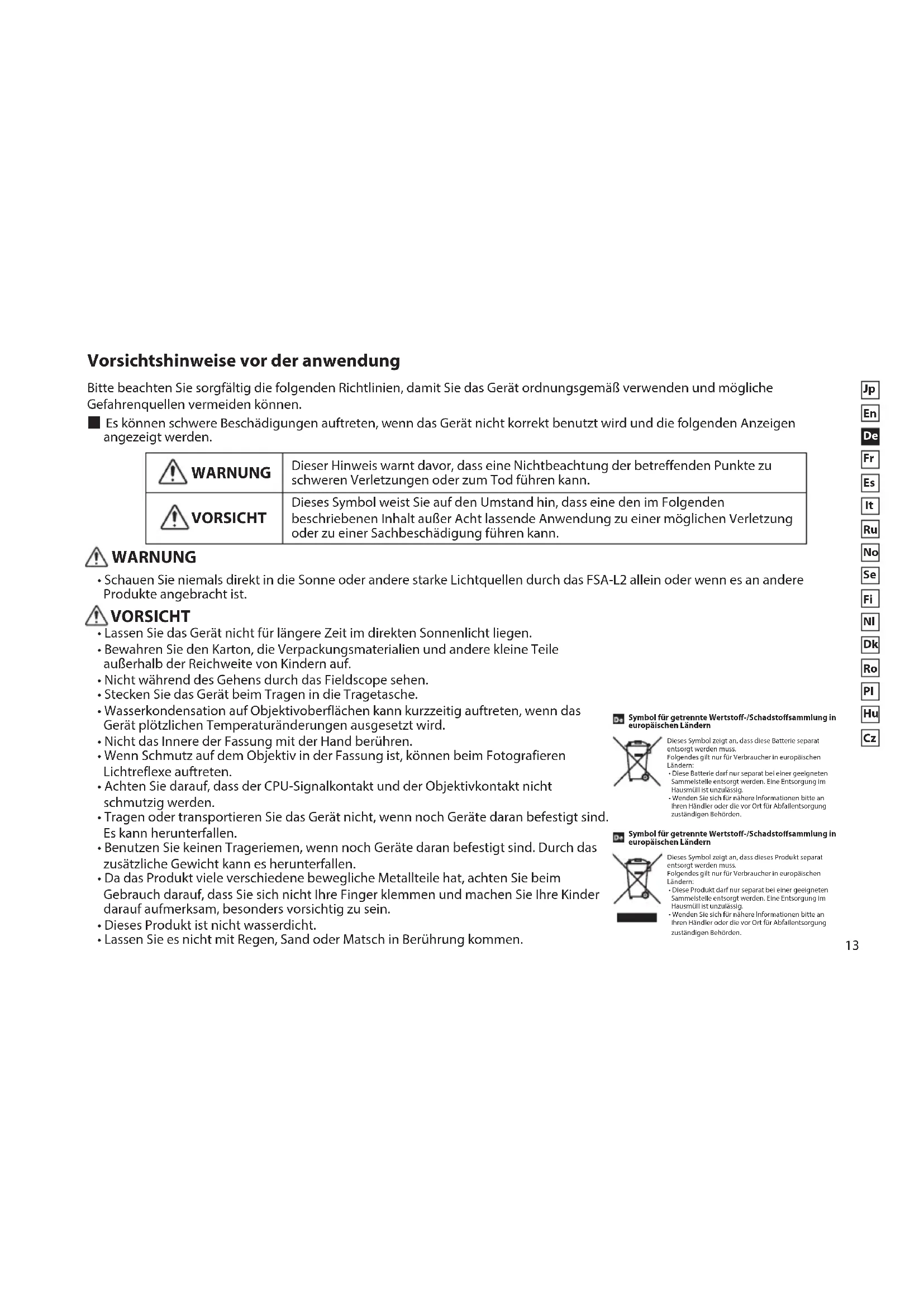 - Schauen Sie niemals direkt in die Sonne oder andere starke Lichtquellen durch das FSA-L2 allein oder wenn es an andere Produkte angebracht ist. Dieses Symbol zeigt an, dass diese Batterie separat entsorgt werden muss.Folgendes gilt nur für Verbraucher in europäischen Ländern: • Diese Batterie darf nur separat bei einer geeigneten SammeIsteIIe entsorgt werden. Eine Entsorgung im HausmüII ist unzulässig. • Wenden Sie sich für nähere lnformationen bitte an Ihren Händler oder die vor Ort für AbfaIlentsorgung zuständigen Behörden.Symbol für getrennte Wertsto-/Schadstosammlung in europäischen LändernSymbol für getrennte Wertsto-/Schadstosammlung in europäischen LändernDieses Symbol zeigt an, dass dieses Produkt separat entsorgt werden muss.Folgendes gilt nur für Verbraucher in europäischen Ländern: • Diese Produkt darf nur separat bei einer geeigneten SammeIsteIIe entsorgt werden. Eine Entsorgung im HausmüII ist unzulässig. • Wenden Sie sich für nähere lnformationen bitte an Ihren Händler oder die vor Ort für AbfaIlentsorgung zuständigen Behörden.14
