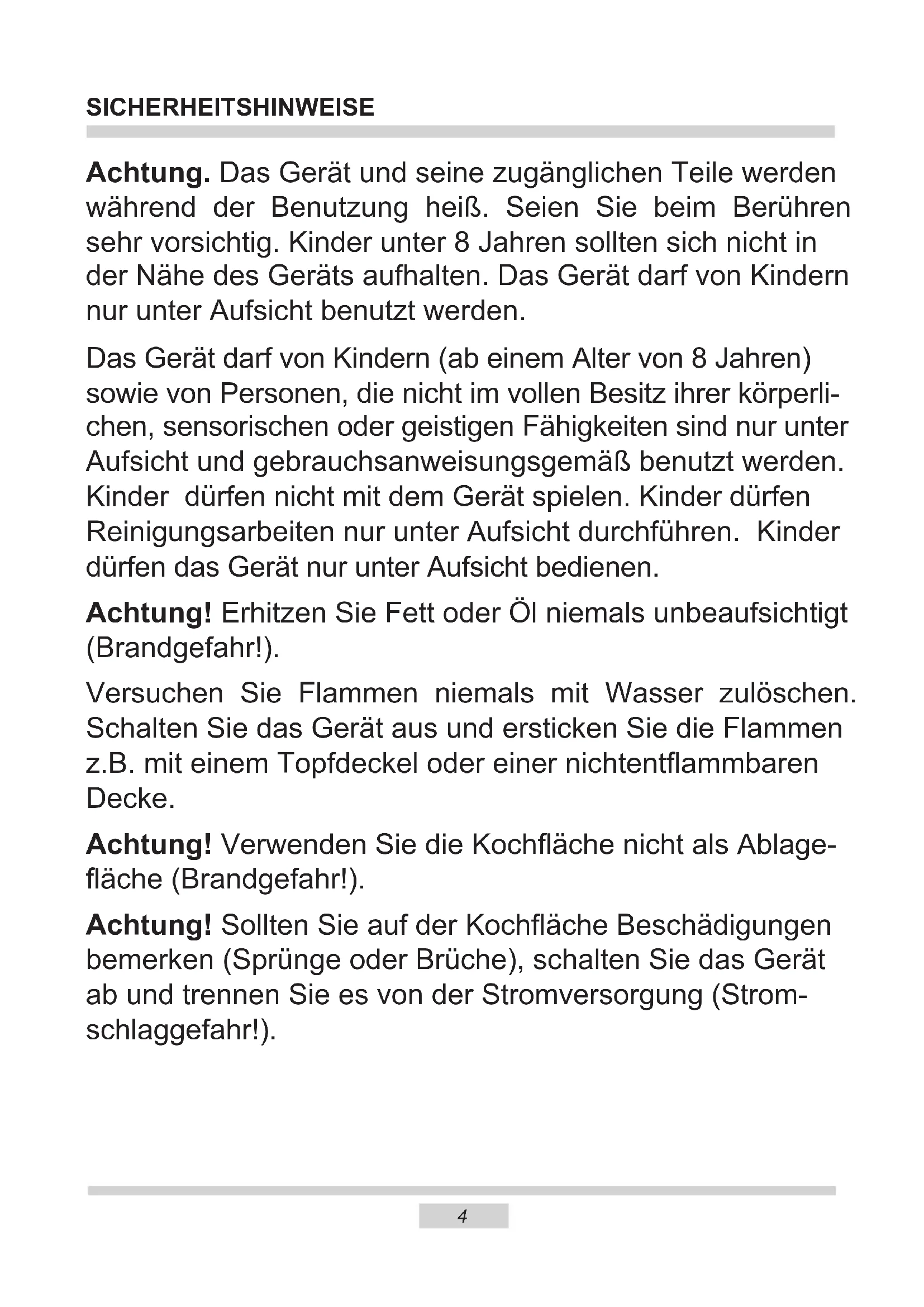 - Technische Daten SICHERHEITSHINWEISE Achtung. Das Gerät und seine zugänglichen Teile werden während der Benutzung heiß. Seien Sie beim Berühren sehr vorsichtig. Kinder unter 8 Jahren sollten sich nicht in der Nähe des Geräts aufhalten. Das Gerät darf von Kindern nur unter Aufsicht benutzt werden. Das Gerät darf von Kindern (ab einem Alter von 8 Jahren) sowie von Personen, die nicht im vollen Besitz ihrer körperli- chen, sensorischen oder geistigen Fähigkeiten sind nur unter Aufsicht und gebrauchsanweisungsgemäß benutzt werden. Kinder dürfen nicht mit dem Gerät spielen. Kinder dürfen Reinigungsarbeiten nur unter Aufsicht durchführen. Kinder dürfen das Gerät nur unter Aufsicht bedienen. Achtung! Erhitzen Sie Fett oder Öl niemals unbeaufsichtigt (Brandgefahr!). Versuchen Sie Flammen niemals mit Wasser zulöschen. Schalten Sie das Gerät aus und ersticken Sie die Flammen z.B. mit einem Topfdeckel oder einer nichtentammbaren Decke. Achtung! Verwenden Sie die Kochäche nicht als Ablage- äche (Brandgefahr!). Achtung! Sollten Sie auf der Kochäche Beschädigungen bemerken (Sprünge oder Brüche), schalten Sie das Gerät ab und trennen Sie es von der Stromversorgung (Strom- schlaggefahr!).5 SICHERHEITSHINWEISE Starke Erhitzung des Geräts während des Betriebs. Seien Sie vorsichtig und vermeiden Sie das Berühren der heißen Innenteile des Geräts. Zugängliche Teile können bei Be nut zung heiß werden. Kin- der fern halten. Achtung. Verwenden Sie zur Reinigung der Kochäche keine aggressiven Putzmittel oder scharfen Metallgegen- stände, die die Oberäche beschädigen könnten (Entstehung von Sprüngen oder Brüchen). Achtung.Um Stromschläge zu vermeiden, muss man sich vor dem Wechsel die Glühlampe vergewissern, dass das Gerät abgeschaltet ist. Zur Reinigung des Geräts keine Dampfreiniger verwen- den. Verbrühungsgefahr! Heißer Dampf kann beim Öffnen der Gerätetür entweichen. Während oder nach dem Garbetrieb die Gerätetür vorsichtig öffnen. Beim Öffnen nicht über die Gerätetür beugen. Beachten Sie, dass Dampf je nach Tem- peratur nicht sichtbar ist.6 SICHERHEITSHINWEISE ● Andere Haushaltsgeräte samt ihren Anschlusskabeln dürfen den Backofen nicht berühren oder auf den Kochächen auiegen, da deren Isolierung nicht hitzebe- ständig ist. ● Beim Braten den Herd nicht ohne Aufsicht lassen! Öl und Fett können sich durch Überhitzen oder Überlaufen selbst entzünden. ● Kochplatte von Verschmutzungen und übergelaufenem Kochgut freihalten. Dies betrifft insbesondere Zucker, der mit dem Glaskeramik-Kochfeld reagiert und da- durch eine bleibende Beschädigung verursachen kann. Etwaige Verschmutzungen sind laufend zu beseitigen. ● Zur Vermeidung von irreversiblen Veränderungen des Kochfelds darf Geschirr mit feuchtem Boden nicht auf warme Kochächen gestellt werden. ● Nur Kochgeschirr verwenden, das nach Herstelleragaben für die Verwendung auf Glaskeramik-Kochfeldern geeignet ist. ● Bei Feststellung einer Beschädigung des Kochfelds – Kratzern, Rissen oder Ab- splitterungen – ist der Betrieb des Herdes sofort abzubrechen und die Reparatur bei der Kundendienststelle zu melden. ● Das Kochfeld nicht einschalten, ohne vorher ein Kochgeschirr darauf zu stellen. ● Scharfkantiges Geschirr, das eine Beschädigung des Kochfelds verursachen kann, darf nicht benutzt werden. ● Nicht auf die sich vorheizenden (nicht mit Geschirr überdeckten) Halogen-Koch- ächen schauen. ● Kochgeschirr mit einem Gewicht über 15 kg darf nicht auf die geöffnete Backofen- tür und Kochgeschirr mit einem Gewicht über 25 kg auf die Kochächen gestellt werden. ● Keine Scheuermittel oder scharfen Metallgegenstände zur Glasreinigung verwen- den; sie können die Oberäche zerkratzen, was dazu führen kann, dass das Glas springt. ● In nicht betriebsfähigem Zustand darf der Herd nicht benutzt werden. Sämtliche Mängel dürfen nur von einer autorisierten Fachkraft beseitigt werden. ● Bei Betriebsstörungen, die durch technische Mängel verursacht sind, muss unbe- dingt die Stromzufuhr unterbrochen und eine Reparatur veranlasst werden. ● Dieses Gerät ist nicht für eine Bedienung durch Personen mit eingeschränkten physischen, psychischen bzw. sensorischen Fähigkeiten (darunter Kinder) bzw. Personen ohne Kenntnis des Gerätes vorgesehen, es sei denn, dies erfolgt unter Aufsicht oder gemäß der Bedienungsanleitung des Gerätes, die durch die für die Sicherheit verantwortliche Person übergeben wurde. ● Es ist dafür zu sorgen, dass Kinder nicht mit dem Gerät spielen. ● Das Gerät ist ausschließlich zum Kochen im haushaltsüblichen Rahmen ausgelegt. Ein anderweitiger Gebrauch jeder Art (z.B. zur Raumbeheizung) ist nicht bestim- mungsgemäß und kann gefährlich sein.7 Starke Erhitzung des Ge- räts während des Betriebs. Seien Sie vorsichtig und vermeiden Sie das Berühren der heißen Innenteile des Herdes. Lassen Sie Kinder nicht unbeaufsichtigt an den Herd! Gefahr von Verbrennungen bei direktem Kontakt mit dem eingeschalteten Herd! Andere Haushaltsgeräte samt ihren Anschlusskabeln dürfen den Backofen nicht berühren oder auf den Kochächen auiegen, da deren Isolierung nicht hitze- beständig ist. Beim Braten den Herd nicht ohne Aufsicht lassen! Öl und Fett können sich durch Überhitzen oder Überlaufen selbst ent- zünden. Kochplatte von Verschmutzungen und übergelaufenem Kochgut freihalten. Dies betrifft insbesondere Zucker, der mit dem Glaskeramik-Kochfeld reagiert und dadurch eine bleibende Beschädigung verursachen kann. Etwaige Verschmut- zungen sind laufend zu beseitigen. Zur Vermeidung von irreversiblen Verän- derungen des Kochfelds darf Geschirr mit feuchtem Boden nicht auf warme Kochächen gestellt werden. Nur Kochgeschirr verwenden, das nach Herstelleragaben für die Verwendung auf Glaskeramik-Kochfeldern geeignet ist. Bei Feststellung einer Beschädigung des Kochfelds – Kratzern, Rissen oder Ab- splitterungen – ist der Betrieb des 