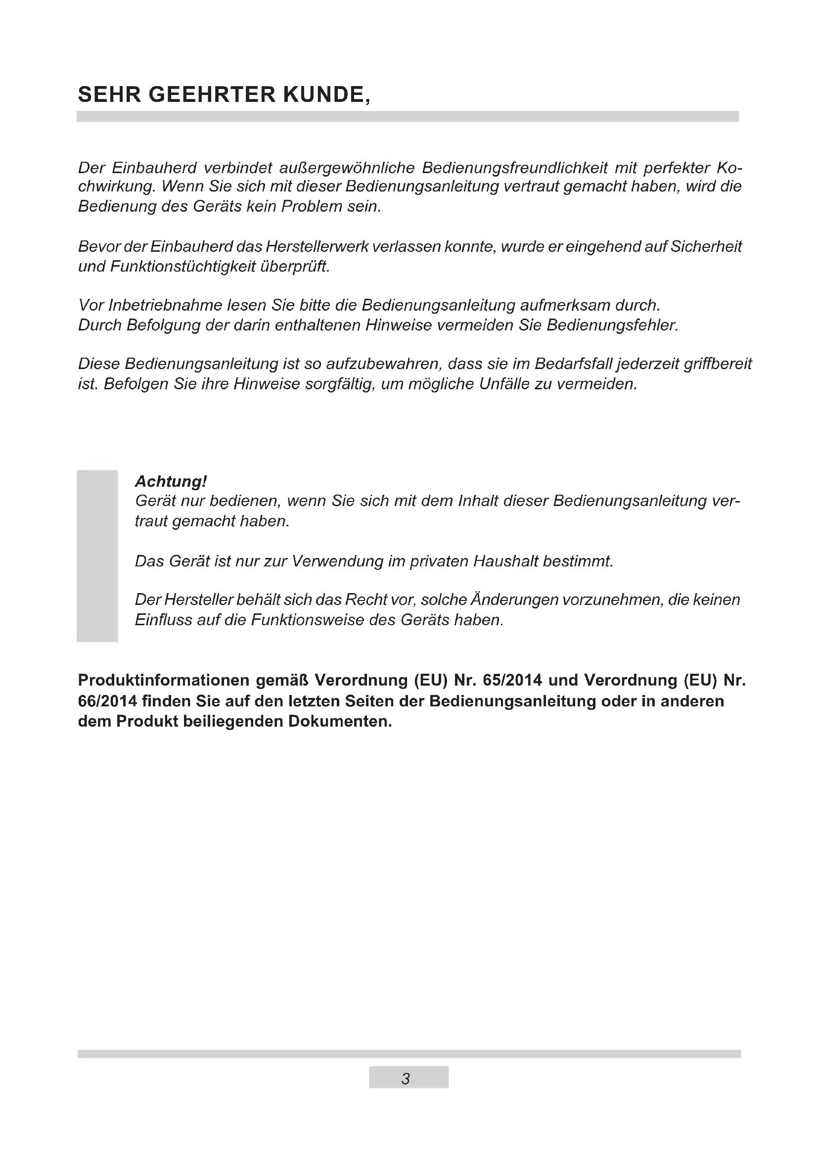 TECHNISCHE GEGEVENS 1583 SEHR GEEHRTER KUNDE, Der Einbauherd verbindet außergewöhnliche Bedienungsfreundlichkeit mit perfekter Ko- chwirkung. Wenn Sie sich mit dieser Bedienungsanleitung vertraut gemacht haben, wird die Bedienung des Geräts kein Problem sein. Bevor der Einbauherd das Herstellerwerk verlassen konnte, wurde er eingehend auf Sicherheit und Funktionstüchtigkeit überprüft. Vor Inbetriebnahme lesen Sie bitte die Bedienungsanleitung aufmerksam durch. Durch Befolgung der darin enthaltenen Hinweise vermeiden Sie Bedienungsfehler. Diese Bedienungsanleitung ist so aufzubewahren, dass sie im Bedarfsfall jederzeit gribereit ist. Befolgen Sie ihre Hinweise sorgfältig, um mögliche Unfälle zu vermeiden. Achtung! Gerät nur bedienen, wenn Sie sich mit dem Inhalt dieser Bedienungsanleitung ver- traut gemacht haben. Das Gerät ist nur zur Verwendung im privaten Haushalt bestimmt. Der Hersteller behält sich das Recht vor, solche Änderungen vorzunehmen, die keinen Einuss auf die Funktionsweise des Geräts haben. Produktinformationen gemäß Verordnung (EU) Nr. 65/2014 und Verordnung (EU) Nr. 66/2014 nden Sie auf den letzten Seiten der Bedienungsanleitung oder in anderen dem Produkt beiliegenden Dokumenten. DE4 SICHERHEITSHINWEISE Achtung. Das Gerät und seine zugänglichen Teile werden während der Benutzung heiß. Seien Sie beim Berühren sehr vorsichtig. Kinder unter 8 Jahren sollten sich nicht in der Nähe des Geräts aufhalten. Das Gerät darf von Kindern nur unter Aufsicht benutzt werden. Das Gerät darf von Kindern (ab einem Alter von 8 Jahren) sowie von Personen, die nicht im vollen Besitz ihrer körperli- chen, sensorischen oder geistigen Fähigkeiten sind nur unter Aufsicht und gebrauchsanweisungsgemäß benutzt werden. Kinder dürfen nicht mit dem Gerät spielen. Kinder dürfen Reinigungsarbeiten nur unter Aufsicht durchführen. Kinder dürfen das Gerät nur unter Aufsicht bedienen. Achtung! Erhitzen Sie Fett oder Öl niemals unbeaufsichtigt (Brandgefahr!). Versuchen Sie Flammen niemals mit Wasser zulöschen. Schalten Sie das Gerät aus und ersticken Sie die Flammen z.B. mit einem Topfdeckel oder einer nichtentammbaren Decke. Achtung! Verwenden Sie die Kochäche nicht als Ablage- äche (Brandgefahr!). Achtung! Sollten Sie auf der Kochäche Beschädigungen bemerken (Sprünge oder Brüche), schalten Sie das Gerät ab und trennen Sie es von der Stromversorgung (Strom- schlaggefahr!).5 SICHERHEITSHINWEISE Starke Erhitzung des Geräts während des Betriebs. Seien Sie vorsichtig und vermeiden Sie das Berühren der heißen Innenteile des Geräts. Zugängliche Teile können bei Be nut zung heiß werden. Kin- der fern halten. Achtung. Verwenden Sie zur Reinigung der Kochäche keine aggressiven Putzmittel oder scharfen Metallgegen- stände, die die Oberäche beschädigen könnten (Entstehung von Sprüngen oder Brüchen). Achtung.Um Stromschläge zu vermeiden, muss man sich vor dem Wechsel die Glühlampe vergewissern, dass das Gerät abgeschaltet ist. Zur Reinigung des Geräts keine Dampfreiniger verwen- den. Verbrühungsgefahr! Heißer Dampf kann beim Önen der Gerätetür entweichen. Während oder nach dem Garbetrieb die Gerätetür vorsichtig önen. Beim Önen nicht über die Gerätetür beugen. Beachten Sie, dass Dampf je nach Tem- peratur nicht sichtbar ist.6 SICHERHEITSHINWEISE ● Andere Haushaltsgeräte samt ihren Anschlusskabeln dürfen den Backofen nicht berühren oder auf den Kochächen auiegen, da deren Isolierung nicht hitzebe- ständig ist. ● Beim Braten den Herd nicht ohne Aufsicht lassen! Öl und Fett können sich durch Überhitzen oder Überlaufen selbst entzünden. ● Kochplatte von Verschmutzungen und übergelaufenem Kochgut freihalten. Dies betrit insbesondere Zucker, der mit dem Glaskeramik-Kochfeld reagiert und da- durch eine bleibende Beschädigung verursachen kann. Etwaige Verschmutzungen sind laufend zu beseitigen. ● Zur Vermeidung von irreversiblen Veränderungen des Kochfelds darf Geschirr mit feuchtem Boden nicht auf warme Kochächen gestellt werden. ● Nur Kochgeschirr verwenden, das nach Herstelleragaben für die Verwendung auf Glaskeramik-Kochfeldern geeignet ist. ● Bei Feststellung einer Beschädigung des Kochfelds – Kratzern, Rissen oder Ab- splitterungen – ist der Betrieb des Herdes sofort abzubrechen und die Reparatur bei der Kundendienststelle zu melden. ● Das Kochfeld nicht einschalten, ohne vorher ein Kochgeschirr darauf zu stellen. ● Scharfkantiges Geschirr, das eine Beschädigung des Kochfelds verursachen kann, darf nicht benutzt werden. ● Nicht auf die sich vorheizenden (nicht mit Geschirr überdeckten) Halogen-Koch- ächen schauen. ● Kochgeschirr mit einem Gewicht über 15 kg darf nicht auf die geönete Backofen- tür und Kochgeschirr mit einem Gewicht über 25 kg auf die Kochächen gestellt werden. ● Keine Scheuermittel oder scharfen Metallgegenstände zur Glasreinigung verwen- den; sie können die Oberäche zerkratzen, was dazu führen kann, dass das Glas springt. ● In nicht betriebsfähigem Zustand darf der Herd nicht benutzt werden. Sämtliche Mängel dürfen nur von einer autorisierten Fachkraft beseitigt werden. ● Bei Betriebsstörungen, die durch technische Mängel verursacht sind, muss unbe- dingt die Stromzufuhr unterbrochen und eine Reparatur veranlasst werden. ● Dieses Gerät ist nicht für eine Bedienung durch Personen mit eingeschränkten physischen, psychischen bzw. sensorischen Fähigkeiten (darunter Kinder) bzw. Personen ohne Kenntnis des Gerätes vorgesehen, es sei denn, dies erfolgt unter Aufsicht oder gemäß der Bedienungsanleitung des Gerätes, die durch die für die Sicherheit verantwortliche Person übergeben wurde. ● Es ist dafür zu sorgen, dass Kinder nicht mit dem Gerät spielen. ● Das Gerät ist ausschließlich zum Kochen im haushaltsüblichen Rahmen ausgelegt. Ein anderweitiger Gebrauch jeder Art (z.B. zur Raumbeheizung) ist nicht bestim- mungsgemäß und kann gefährlich sein.7 W