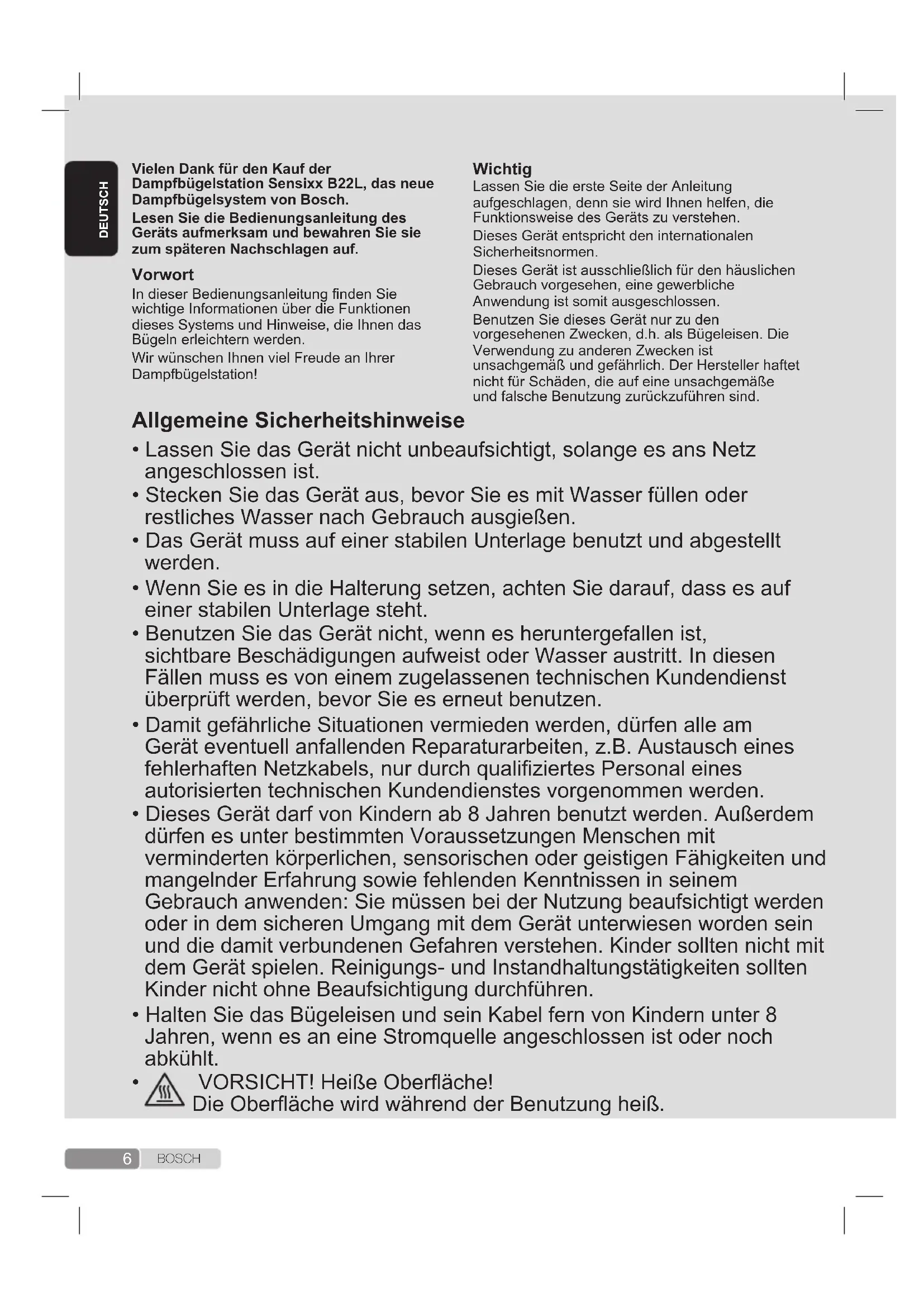 Lassen Sie die erste Seite der Anleitung aufgeschlagen, denn sie wird Ihnen helfen, die Funktionsweise des Geräts zu verstehen.Dieses Gerät entspricht den internationalen Sicherheitsnormen.Dieses Gerät ist ausschließlich für den häuslichen Gebrauch vorgesehen, eine gewerbliche Anwendung ist somit ausgeschlossen.Benutzen Sie dieses Gerät nur zu den vorgesehenen Zwecken, d.h. als Bügeleisen. Die Verwendung zu anderen Zwecken ist unsachgemäß und gefährlich. Der Hersteller haftet nicht für Schäden, die auf eine unsachgemäße und falsche Benutzung zurückzuführen sind.8 B O S C H