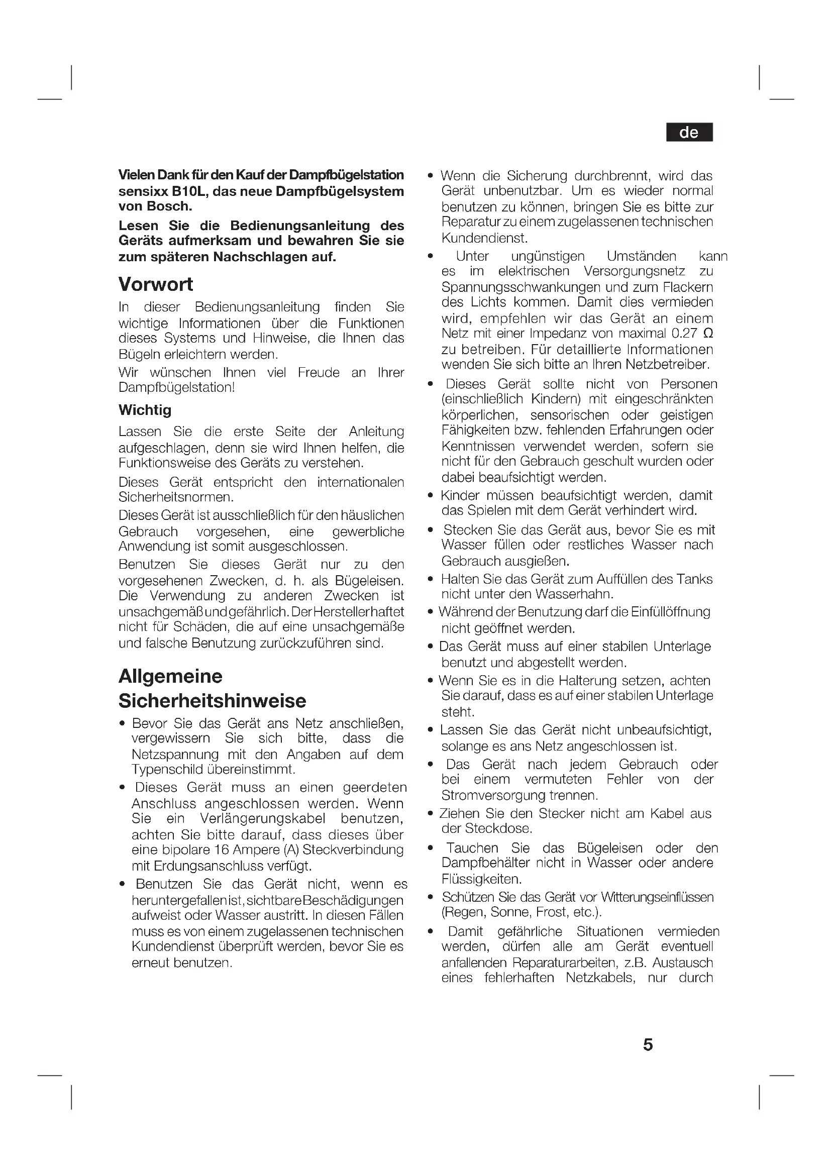 Vielen Dank für den Kauf der Dampfbügelstation sensixx B10L, das neue Dampfbügelsystem von Bosch. Lesen Sie die Bedienungsanleitung des Geräts aufmerksam und bewahren Sie sie zum späteren Nachschlagen auf. Vorwort In dieser Bedienungsanleitung finden Sie wichtige Informationen über die Funktionen dieses Systems und Hinweise, die Ihnen das Bügeln erleichtern werden. Wir wünschen Ihnen viel Freude an Ihrer Dampfbügelstation! Wichtig Lassen Sie die erste Seite der Anleitung aufgeschlagen, denn sie wird Ihnen helfen, die Funktionsweise des Geräts zu verstehen. Dieses Gerät entspricht den internationalen Sicherheitsnormen. Dieses Gerät ist ausschließlich für den häuslichen Gebrauch vorgesehen, eine gewerbliche Anwendung ist somit ausgeschlossen. Benutzen Sie dieses Gerät nur zu den vorgesehenen Zwecken, d. h. als Bügeleisen. Die Verwendung zu anderen Zwecken ist unsachgemäß und gefährlich. Der Hersteller haftet nicht für Schäden, die auf eine unsachgemäße und falsche Benutzung zurückzuführen sind. Allgemeine Sicherheitshinweise