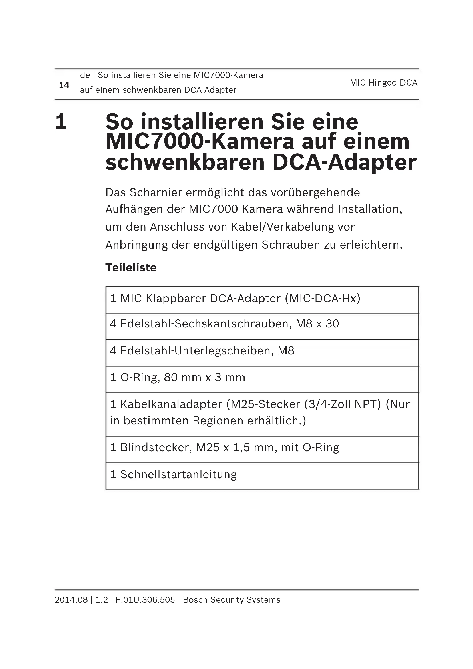 Bosch Security Systems 2014.08 | 1.2 | F.01U.306.505So installieren Sie eine MIC7000-Kamera auf einem schwenkbaren DCA-Adapter Das Scharnier ermöglicht das vorübergehende Aufhängen der MIC7000 Kamera während Installation, um den Anschluss von Kabel/Verkabelung vor Anbringung der endgültigen Schrauben zu erleichtern. Teileliste 1 MIC Klappbarer DCA-Adapter (MIC-DCA-Hx) 4 Edelstahl-Sechskantschrauben, M8 x 30 4 Edelstahl-Unterlegscheiben, M8 1 O-Ring, 80 mm x 3 mm 1 Kabelkanaladapter (M25-Stecker (3/4-Zoll NPT) (Nur in bestimmten Regionen erhältlich.) 1 Blindstecker, M25 x 1,5 mm, mit O-Ring 1 Schnellstartanleitung