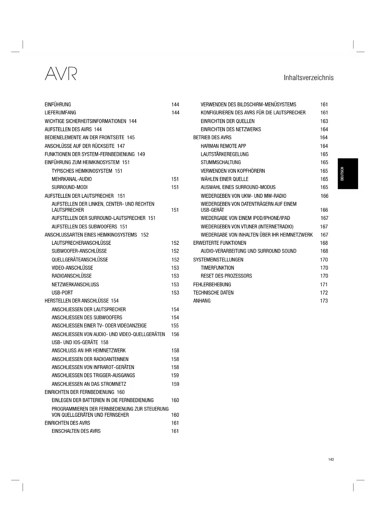 FEHLERBEHEBUNG 171 TECHNISCHE DATEN 172 ANHANG 173144 AVR Einführung, Lieferumfang, Wichtige Sicherheitsinformationen und Aufstellen des AVRs Einführung Vielen Dank, dass Sie sich für dieses Produkt von JBL entschieden haben! Seit über 50 Jahren sieht JBL seine Aufgabe darin, die bestmögliche Klangwiedergabe für Musik und Entertainment zu ermöglichen – und nutzt hierfür die jeweils verfügbare Spitzentechnik. Sidney Harman und Bernard Kardon waren die Erfinder des Receivers, bei dem ein einziges Gerät alles enthält, was den Genuss von Heim-Entertainment so einfach wie irgend möglich macht – und das ohne Abstriche bei der Wiedergabequalität und der maximalen Leistung zu machen. So wurden die Produkte von JBL im Lauf der Zeit immer bedienungsfreundlicher, obwohl sie laufend immer mehr Ausstattung bieten und obendrein besser klingen, als je zuvor. Die digitalen 5.1-Kanal Audio-Video-Receiver (AVRs) AVR 101IN setzen diese Tradition mit einigen der fortschrittlichsten Audio- und Video-Verarbeitungsmöglichkeiten und einer wahren Fülle an Klang- und Bildoptionen fort. Damit dem Höchstgenuss mit Ihrem AVR nichts im Wege steht, lesen Sie bitte diese Anleitung durch und bewahren Sie sie für späteres Nachlesen auf. Falls Sie Fragen zu diesem Produkt, seiner Inbetriebnahme oder seiner Bedienung haben sollten, wenden Sie sich bitte an Ihren JBL-Fachhändler oder HiFi-Spezialisten, oder besuchen Sie unsere Website unter www.jbl.com. Lieferumfang Im Lieferumfang Ihres AVRs sind folgende Komponenten enthalten. Sollte etwas fehlen, wenden Sie sich bitte an Ihren JBL-Händler oder den Kundendienst von JBL unter www.jbl.com.