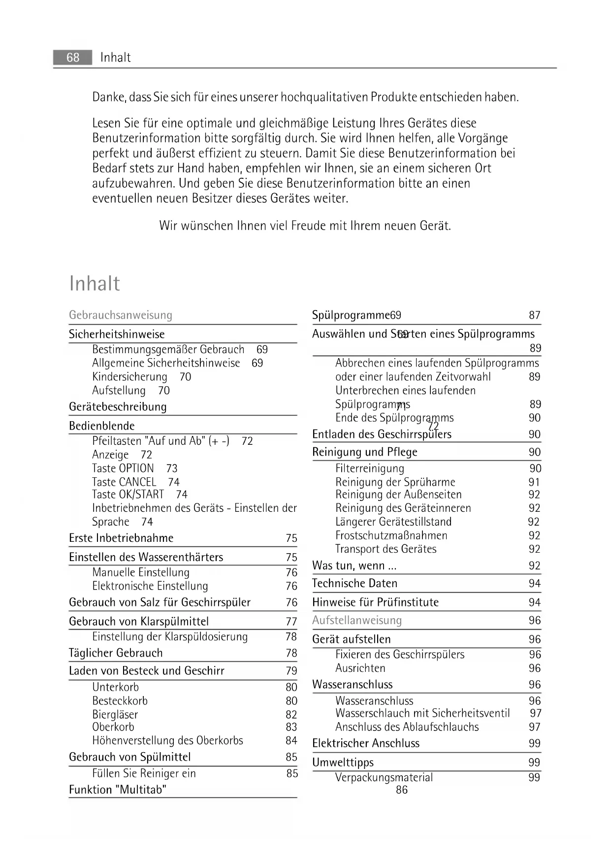 - Éliminez le loquet de la porte, cela évitera aux enfants de s'enfermer dans l'appareil et de mettre ainsi leur vie en danger. En matière de protection de l'environnement 67Danke, dass Sie sich für eines unserer hochqualitativen Produkte entschieden haben. Lesen Sie für eine optimale und gleichmäßige Leistung Ihres Gerätes diese Benutzerinformation bitte sorgfältig durch. Sie wird Ihnen helfen, alle Vorgänge perfekt und äußerst effizient zu steuern. Damit Sie diese Benutzerinformation bei Bedarf stets zur Hand haben, empfehlen wir Ihnen, sie an einem sicheren Ort aufzubewahren. Und geben Sie diese Benutzerinformation bitte an einen eventuellen neuen Besitzer dieses Gerätes weiter. Wir wünschen Ihnen viel Freude mit Ihrem neuen Gerät. Inhalt Gebrauchsanweisung 69 Sicherheitshinweise 69 Bestimmungsgemäßer Gebrauch 69 Allgemeine Sicherheitshinweise 69 Kindersicherung 70 Aufstellung 70 Gerätebeschreibung 71 Bedienblende 72 Pfeiltasten "Auf und Ab" (+ -) 72 Anzeige 72 Taste OPTION 73 Taste CANCEL 74 Taste OK/START 74 Inbetriebnehmen des Geräts - Einstellen der Sprache 74 Erste Inbetriebnahme 75 Einstellen des Wasserenthärters 75 Manuelle Einstellung 76 Elektronische Einstellung 76 Gebrauch von Salz für Geschirrspüler 76 Gebrauch von Klarspülmittel 77 Einstellung der Klarspüldosierung 78 Täglicher Gebrauch 78 Laden von Besteck und Geschirr 79 Unterkorb 80 Besteckkorb 80 Biergläser 82 Oberkorb 83 Höhenverstellung des Oberkorbs 84 Gebrauch von Spülmittel 85 Füllen Sie Reiniger ein 85 Funktion "Multitab" 86 Spülprogramme 87 Auswählen und Starten eines Spülprogramms