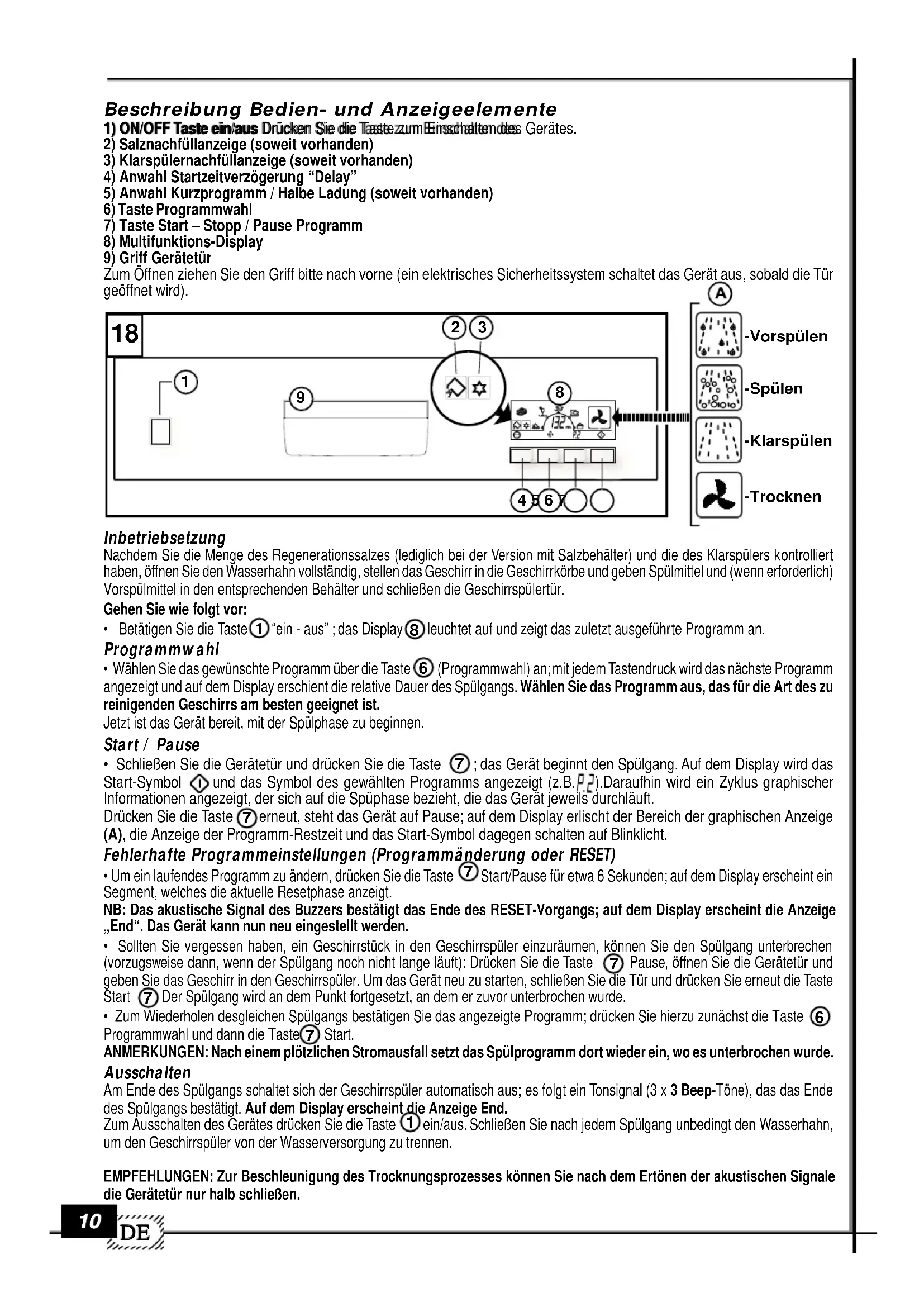 1) ON/OFF Taste ein/aus Drücken Sie die Taste zum Einschalten des Gerätes.2) Salznachfüllanzeige (soweit vorhanden)3) Klarspülernachfüllanzeige (soweit vorhanden)4) Anwahl Startzeitverzögerung “Delay”5) Anwahl Kurzprogramm / Halbe Ladung (soweit vorhanden)6) Taste Programmwahl7) Taste Start – Stopp / Pause Programm8) Multifunktions-Display9) Griff Gerätetür Zum Öffnen ziehen Sie den Griff bitte nach vorne (ein elektrisches Sicherheitssystem schaltet das Gerät aus, sobald die Tür geöffnet wird).