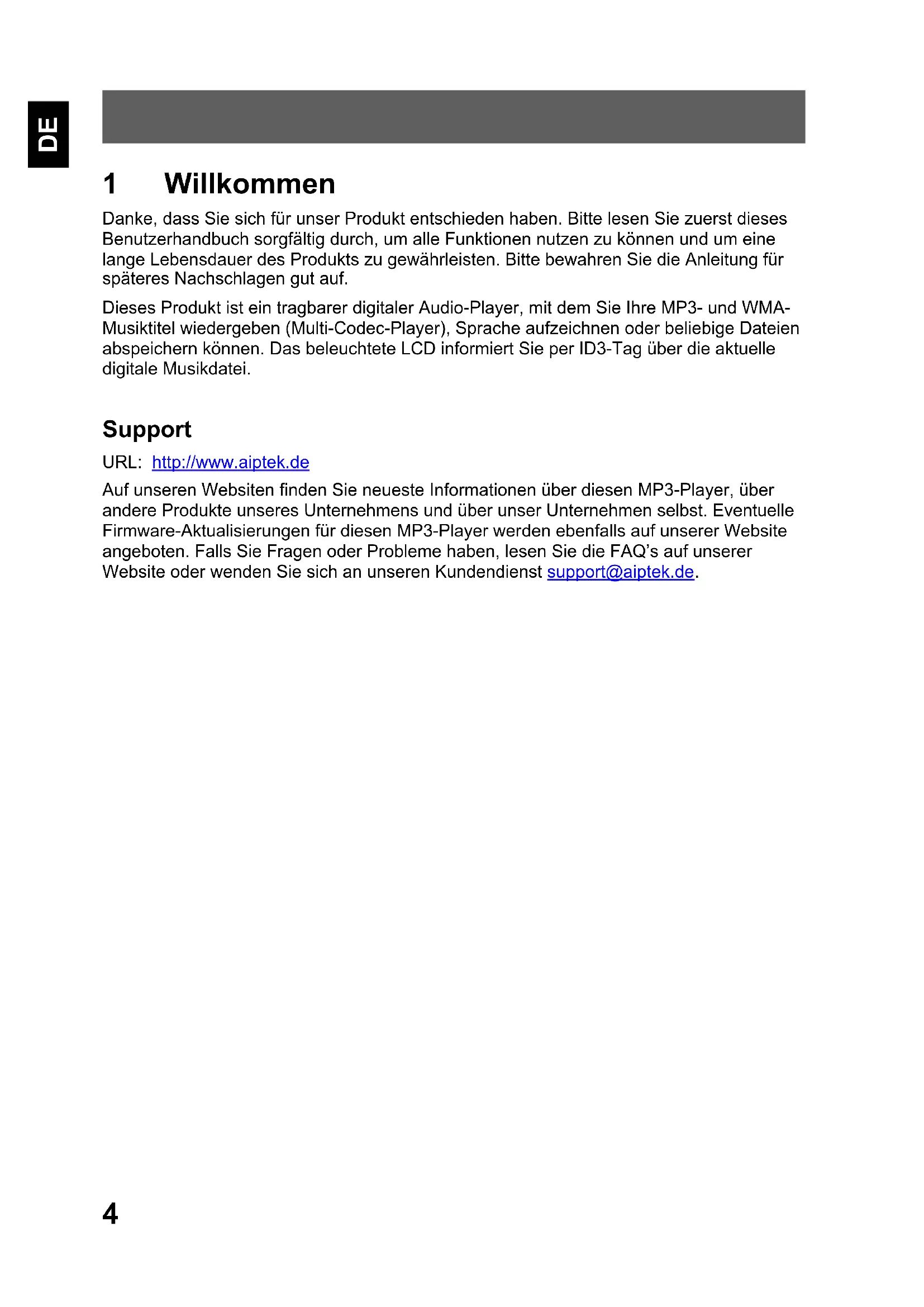 1 Willkommen Danke, dass Sie sich für unser Produkt entschieden haben. Bitte lesen Sie zuerst dieses Benutzerhandbuch sorgfältig durch, um alle Funktionen nutzen zu können und um eine lange Lebensdauer des Produkts zu gewährleisten. Bitte bewahren Sie die Anleitung für späteres Nachschlagen gut auf. Dieses Produkt ist ein tragbarer digitaler Audio-Player, mit dem Sie Ihre MP3- und WMA- Musiktitel wiedergeben (Multi-Codec-Player), Sprache aufzeichnen oder beliebige Dateien abspeichern können. Das beleuchtete LCD informiert Sie per ID3-Tag über die aktuelle digitale Musikdatei. Support URL: http://www.aiptek.de Auf unseren Websiten finden Sie neueste Informationen über diesen MP3-Player, über andere Produkte unseres Unternehmens und über unser Unternehmen selbst. Eventuelle Firmware-Aktualisierungen für diesen MP3-Player werden ebenfalls auf unserer Website angeboten. Falls Sie Fragen oder Probleme haben, lesen Sie die FAQ’s auf unserer Website oder wenden Sie sich an unseren Kundendienst support@aiptek.de