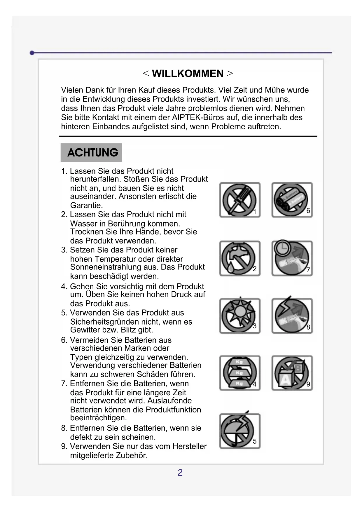herunterfallen. Stoßen Sie das Produkt nicht an, und bauen Sie es nicht auseinander. Ansonsten erlischt die Garantie.