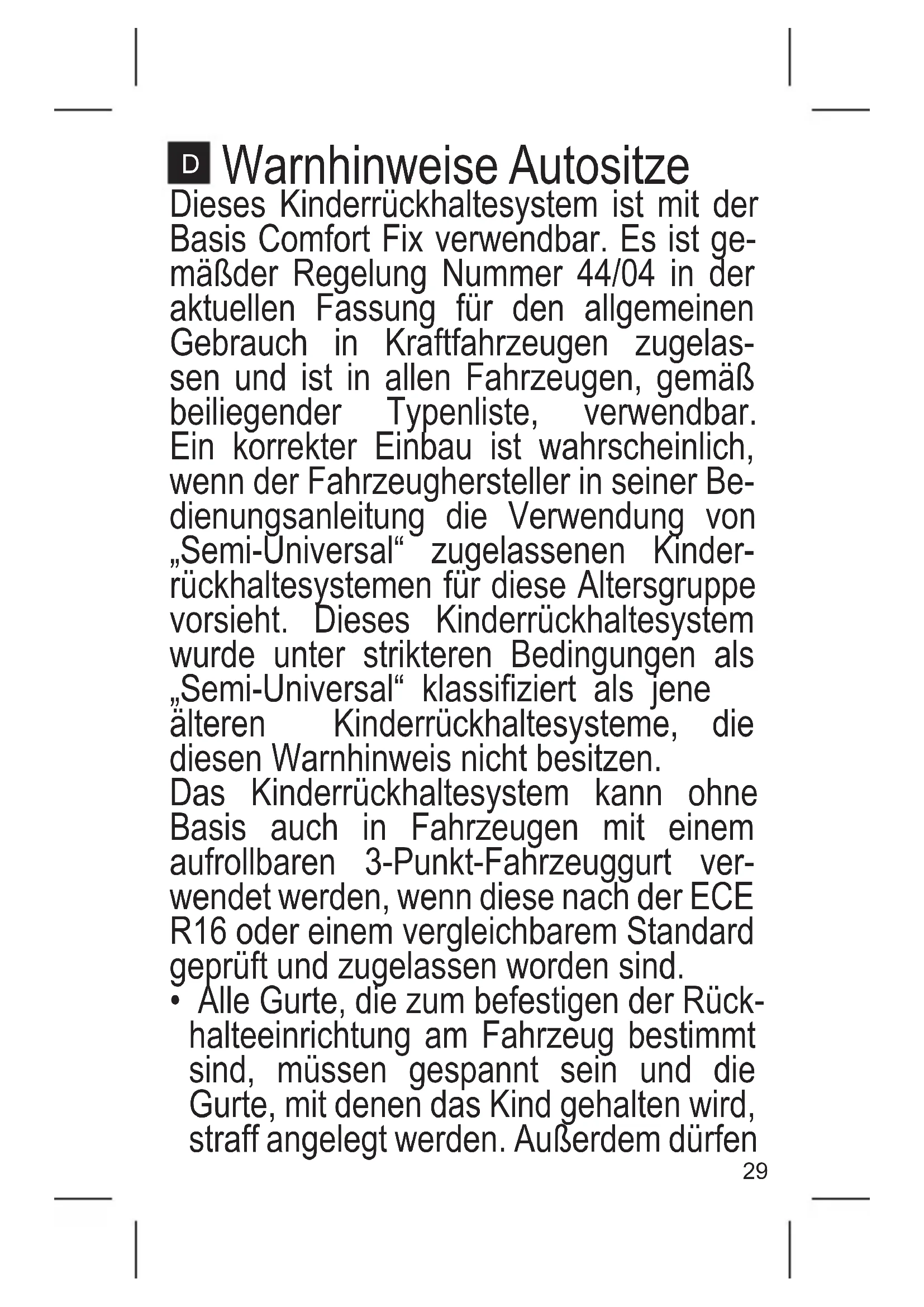 Warnhinweise Autositze Dieses Kinderrückhaltesystem ist mit der Basis Comfort Fix verwendbar. Es ist ge- mäßder Regelung Nummer 44/04 in der aktuellen Fassung für den allgemeinen Gebrauch in Kraftfahrzeugen zugelas- sen und ist in allen Fahrzeugen, gemäß beiliegender Typenliste, verwendbar. Ein korrekter Einbau ist wahrscheinlich, wenn der Fahrzeughersteller in seiner Be- dienungsanleitung die Verwendung von „Semi-Universal“ zugelassenen Kinder- rückhaltesystemen für diese Altersgruppe vorsieht. Dieses Kinderrückhaltesystem wurde unter strikteren Bedingungen als „Semi-Universal“ klassiziert als jene älteren Kinderrückhaltesysteme, die diesen Warnhinweis nicht besitzen. Das Kinderrückhaltesystem kann ohne Basis auch in Fahrzeugen mit einem aufrollbaren 3-Punkt-Fahrzeuggurt ver- wendet werden, wenn diese nach der ECE R16 oder einem vergleichbarem Standard geprüft und zugelassen worden sind.