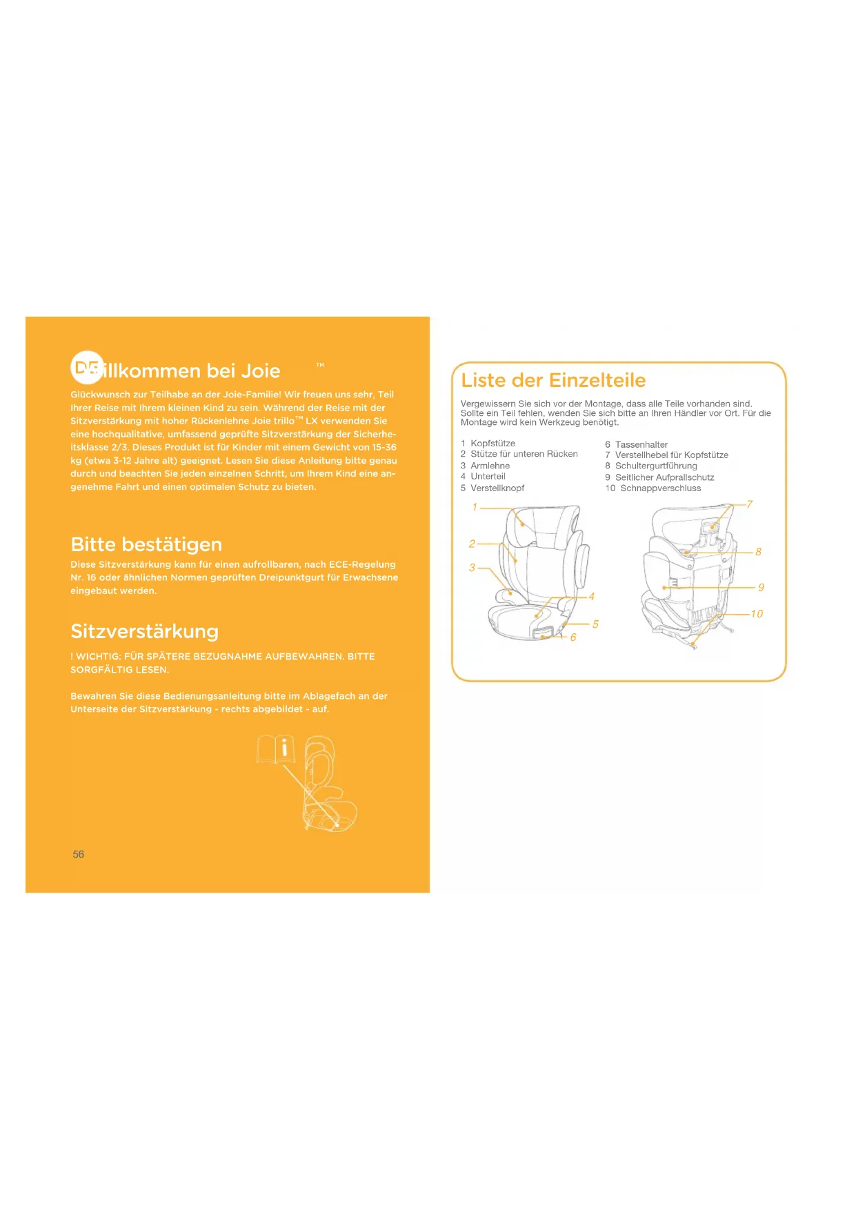 Glückwunsch zur Teilhabe an der Joie-Familie! Wir freuen uns sehr, Teil Ihrer Reise mit Ihrem kleinen Kind zu sein. Während der Reise mit der Sitzverstärkung mit hoher Rückenlehne Joie trillo LX verwenden Sie eine hochqualitative, umfassend geprüfte Sitzverstärkung der Sicherhe-itsklasse 2/3. Dieses Produkt ist für Kinder mit einem Gewicht von 15-36 kg (etwa 3-12 Jahre alt) geeignet. Lesen Sie diese Anleitung bitte genau durch und beachten Sie jeden einzelnen Schritt, um Ihrem Kind eine an-genehme Fahrt und einen optimalen Schutz zu bieten. Bitte bestätigen Diese Sitzverstärkung kann für einen aufrollbaren, nach ECE-Regelung Nr. 16 oder ähnlichen Normen geprüften Dreipunktgurt für Erwachsene eingebaut werden. Sitzverstärkung ! WICHTIG: FÜR SPÄTERE BEZUGNAHME AUFBEWAHREN. BITTE SORGFÄLTIG LESEN. Bewahren Sie diese Bedienungsanleitung bitte im Ablagefach an der Unterseite der Sitzverstärkung - rechts abgebildet - auf.6 Tassenhalter7 Verstellhebel für Kopfstütze8 Schultergurtführung9 Seitlicher Aufprallschutz10 Schnappverschluss Liste der Einzelteile Vergewissern Sie sich vor der Montage, dass alle Teile vorhanden sind. Sollte ein Teil fehlen, wenden Sie sich bitte an Ihren Händler vor Ort. Für die Montage wird kein Werkzeug benötigt.1 Kopfstütze2 Stütze für unteren Rücken3 Armlehne4 Unterteil5 Verstellknopf