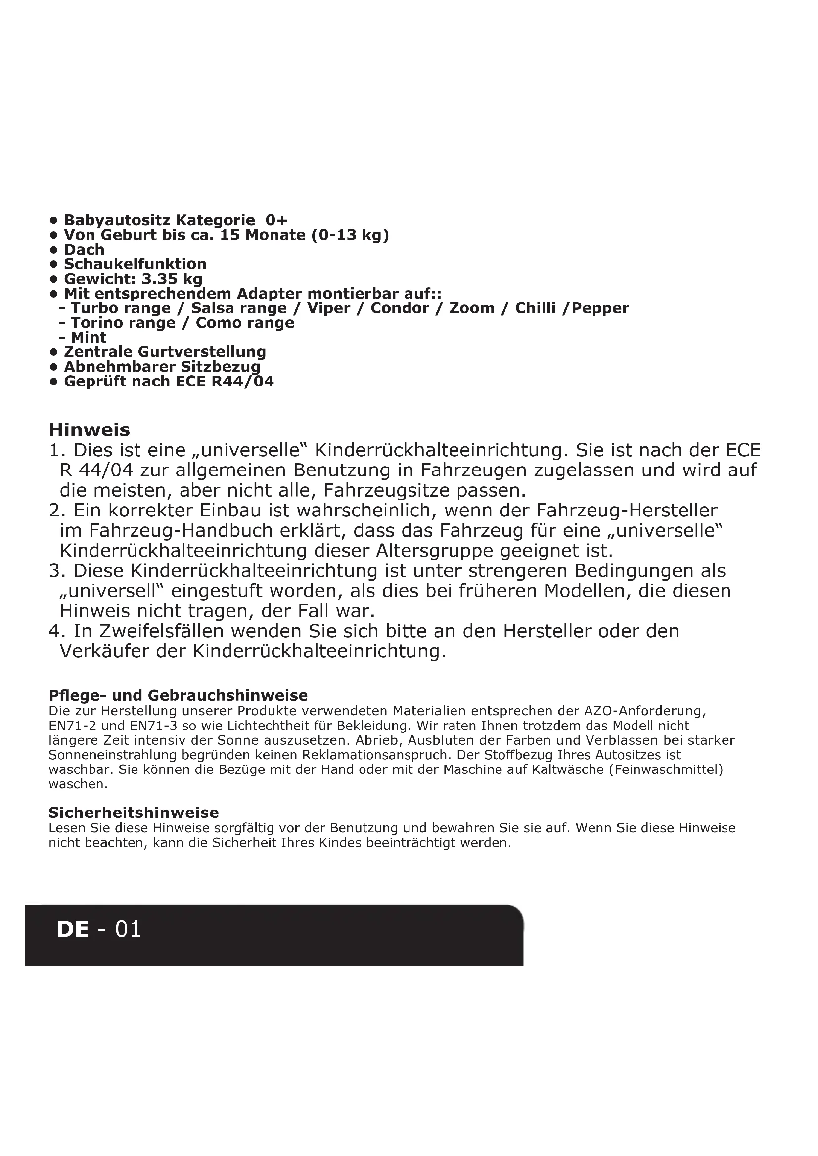 Verkäufer der Kinderrückhalteeinrichtung. Pege- und Gebrauchshinweise Die zur Herstellung unserer Produkte verwendeten Materialien entsprechen der AZO-Anforderung, EN71-2 und EN71-3 so wie Lichtechtheit für Bekleidung. Wir raten Ihnen trotzdem das Modell nicht längere Zeit intensiv der Sonne auszusetzen. Abrieb, Ausbluten der Farben und Verblassen bei starker Sonneneinstrahlung begründen keinen Reklamationsanspruch. Der Stobezug Ihres Autositzes ist waschbar. Sie können die Bezüge mit der Hand oder mit der Maschine auf Kaltwäsche (Feinwaschmittel) waschen. Sicherheitshinweise Lesen Sie diese Hinweise sorgfältig vor der Benutzung und bewahren Sie sie auf. Wenn Sie diese Hinweise nicht beachten, kann die Sicherheit Ihres Kindes beeinträchtigt werden.DE - 02 ACHTUNG: