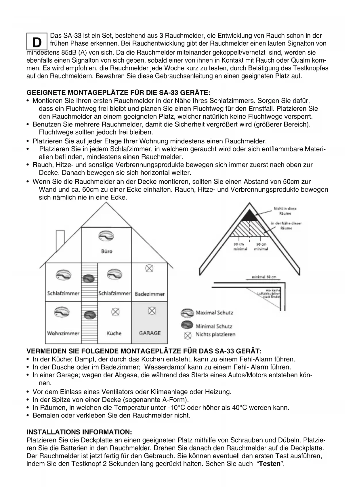 - Benutzen Sie mehrere Rauchmelder, damit die Sicherheit vergrößert wird (größerer Bereich). Fluchtwege sollten jedoch frei bleiben.