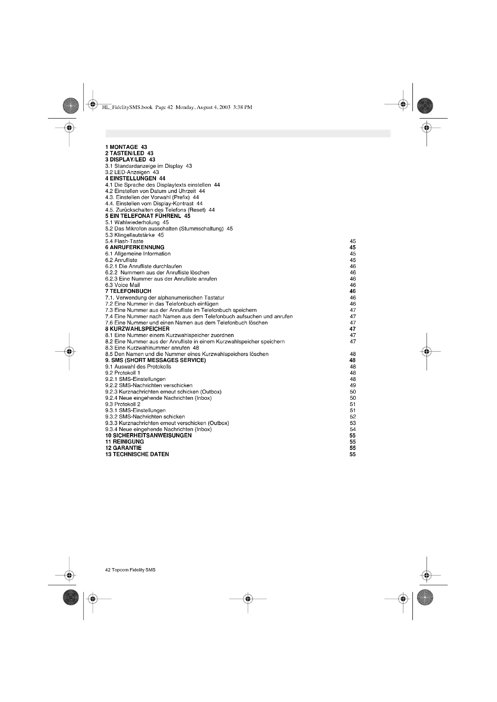 10 SICHERHEITSANWEISUNGEN 55 11 REINIGUNG 55 12 GARANTIE 55 13 TECHNISCHE DATEN 55 HL_FidelitySMS.book Page 42 Monday, August 4, 2003 3:38 PMTopcom Fidelity SMS 43 DEUTSCH 1MONTAGE