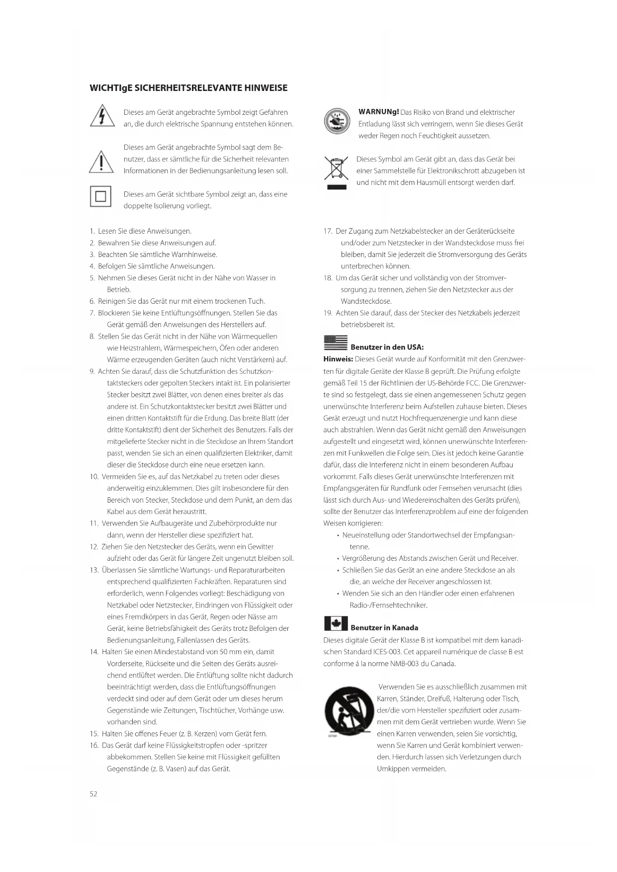 vändning och återvinning, minimerar negativa effekter på miljön och människors hälsa samt undviker straffavgifter för felaktig avfallshantering.52 WICHTIgE SICHERHEITSRELEVANTE HINWEISE Dieses am Gerät angebrachte Symbol zeigt Gefahren an, die durch elektrische Spannung entstehen können. Dieses am Gerät angebrachte Symbol sagt dem Be- nutzer, dass er sämtliche für die Sicherheit relevanten Informationen in der Bedienungsanleitung lesen soll. Dieses am Gerät sichtbare Symbol zeigt an, dass eine doppelte Isolierung vorliegt. WARNUNg! Das Risiko von Brand und elektrischer Entladung lässt sich verringern, wenn Sie dieses Gerät weder Regen noch Feuchtigkeit aussetzen. Dieses Symbol am Gerät gibt an, dass das Gerät bei einer Sammelstelle für Elektronikschrott abzugeben ist und nicht mit dem Hausmüll entsorgt werden darf.