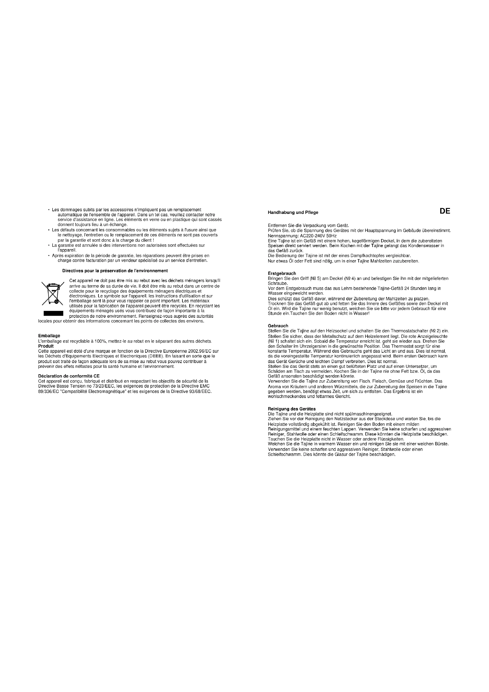 Entfernen Sie die Verpackung vom Gerät. Prüfen Sie, ob die Spannung des Gerätes mit der Hauptspannung im Gebäude übereinstimmt. Nennspannung: AC220-240V 50Hz Eine Tajine ist ein Gefäß mit einem hohen, kegelförmigen Deckel, in dem die zubereiteten Speisen direkt serviert werden. Beim Kochen mit der Tajine gelangt das Kondenswasser in das Gefäß zurück. Die Bedienung der Tajine ist mit der eines Dampfkochtopfes vergleichbar. Nur etwas Öl oder Fett sind nötig, um in einer Tajine Mahlzeiten zuzubereiten. Erstgebrauch Bringen Sie den Griff (Nr. 5) am Deckel (Nr. 4) an und befestigen Sie ihn mit der mitgelieferten Schraube. Vor dem Erstgebrauch muss das aus Lehm bestehende Tajine-Gefäß 24 Stunden lang in Wasser eingeweicht werden. Dies schützt das Gefäß davor, während der Zubereitung der Mahlzeiten zu platzen. Trocknen Sie das Gefäß gut ab und fetten Sie das Innere des Gefäßes sowie den Deckel mit Öl ein. Wird die Tajine nur wenig benutzt, weichen Sie sie bitte vor jedem Gebrauch für eine Stunde ein.Tauchen Sie den Boden nicht in Wasser! Gebrauch Stellen Sie die Tajine auf den Heizsockel und schalten Sie den Thermostatschalter (Nr. 2) ein. Stellen Sie sicher, dass der Metallschutz auf dem Heizelement liegt. Die rote Anzeigeleuchte (Nr. 1) schaltet sich ein. Sobald die Temperatur erreicht ist, geht sie wieder aus. Drehen Sie den Schalter im Uhrzeigersinn in die gewünschte Position. Das Thermostat sorgt für eine konstante Temperatur. Während des Gebrauchs geht das Licht an und aus. Dies ist normal, da die voreingestellte Temperatur kontinuierlich angepasst wird. Beim ersten Gebrauch kann das Gerät Gerüche und leichten Dampf verbreiten. Dies ist normal. Stellen Sie das Gerät stets an einen gut belüfteten Platz und auf einen Untersetzer, um Schäden am Tisch zu vermeiden. Kochen Sie in der Tajine nie ohne Fett bzw. Öl, da das Gefäß ansonsten beschädigt werden könnte. Verwenden Sie die Tajine zur Zubereitung von Fisch, Fleisch, Gemüse und Früchten. Das Aroma von Kräutern und anderen Würzmitteln, die zur Zubereitung der Speisen in die Tajine gegeben werden, benötigt etwas Zeit, um sich zu entfalten. Das Ergebnis ist ein wohlschmeckendes und fettarmes Gericht. Reinigung des Gerätes Die Tajine und die Heizplatte sind nicht spülmaschinengeeignet. Ziehen Sie vor der Reinigung den Netzstecker aus der Steckdose und warten Sie, bis die Heizplatte vollständig abgekühlt ist. Reinigen Sie den Boden mit einem milden Reinigungsmittel und einem feuchten Lappen. Verwenden Sie keine scharfen und aggressiven Reiniger, Stahlwolle oder einen Schleifschwamm. Diese könnten die Heizplatte beschädigen. Tauchen Sie die Heizplatte nicht in Wasser oder andere Flüssigkeiten. Weichen Sie die Tajine in warmem Wasser ein und reinigen Sie sie mit einer weichen Bürste. Verwenden Sie keine scharfen und aggressiven Reiniger, Stahlwolle oder einen Schleifschwamm. Dies könnte die Glasur der Tajine beschädigen.WICHTIGE SICHERHEITSHINWEISE