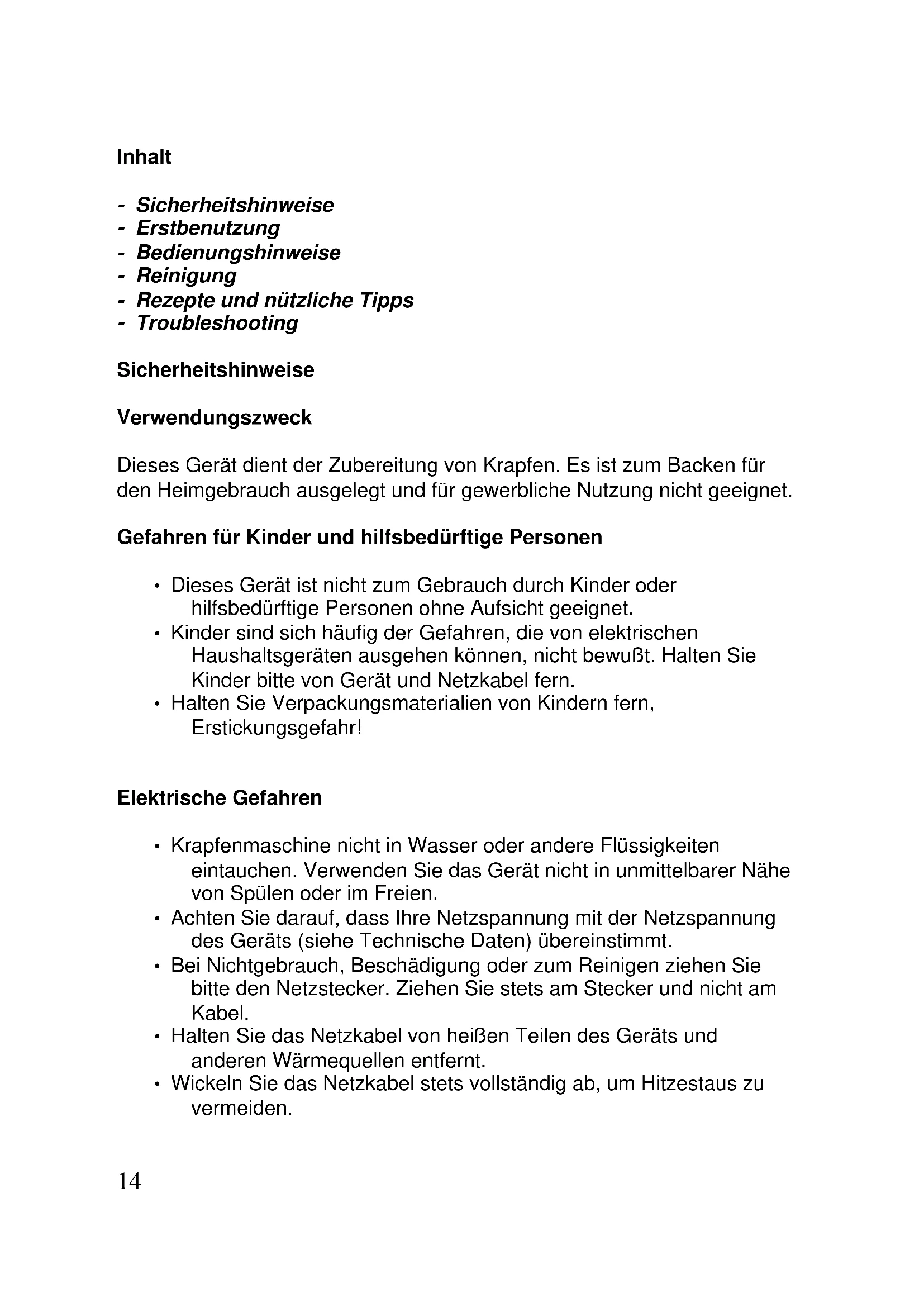 Inhalt - Sicherheitshinweise - Erstbenutzung - Bedienungshinweise - Reinigung - Rezepte und nützliche Tipps - Troubleshooting Sicherheitshinweise Verwendungszweck Dieses Gerät dient der Zubereitung von Krapfen. Es ist zum Backen für den Heimgebrauch ausgelegt und für gewerbliche Nutzung nicht geeignet. Gefahren für Kinder und hilfsbedürftige Personen