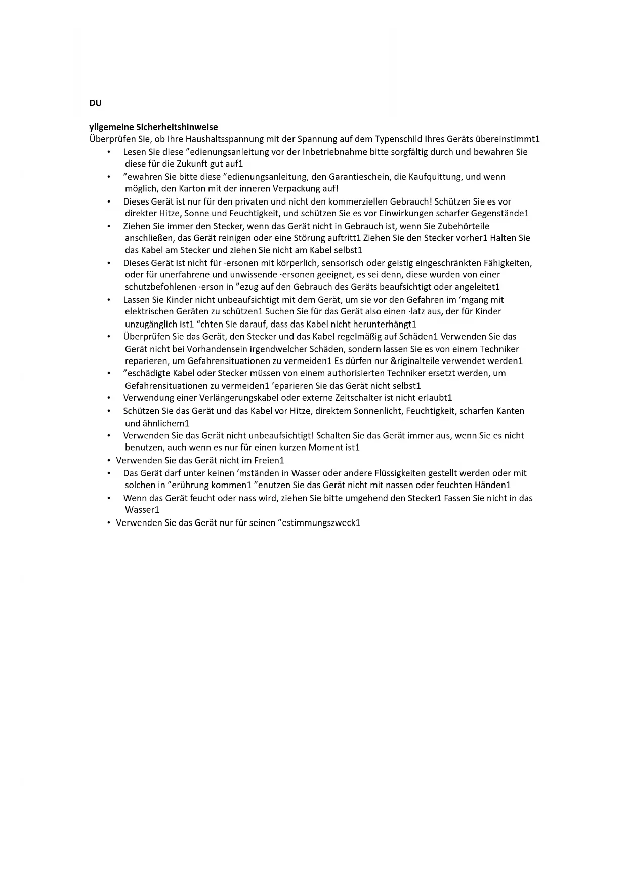 - Dieses Gerät ist nicht für Personen mit körperlich, sensorisch oder geistig eingeschränkten Fähigkeiten, oder für unerfahrene und unwissende Personen geeignet, es sei denn, diese wurden von einer schutzbefohlenen Person in Bezug auf den Gebrauch des Geräts beaufsichtigt oder angeleitet.