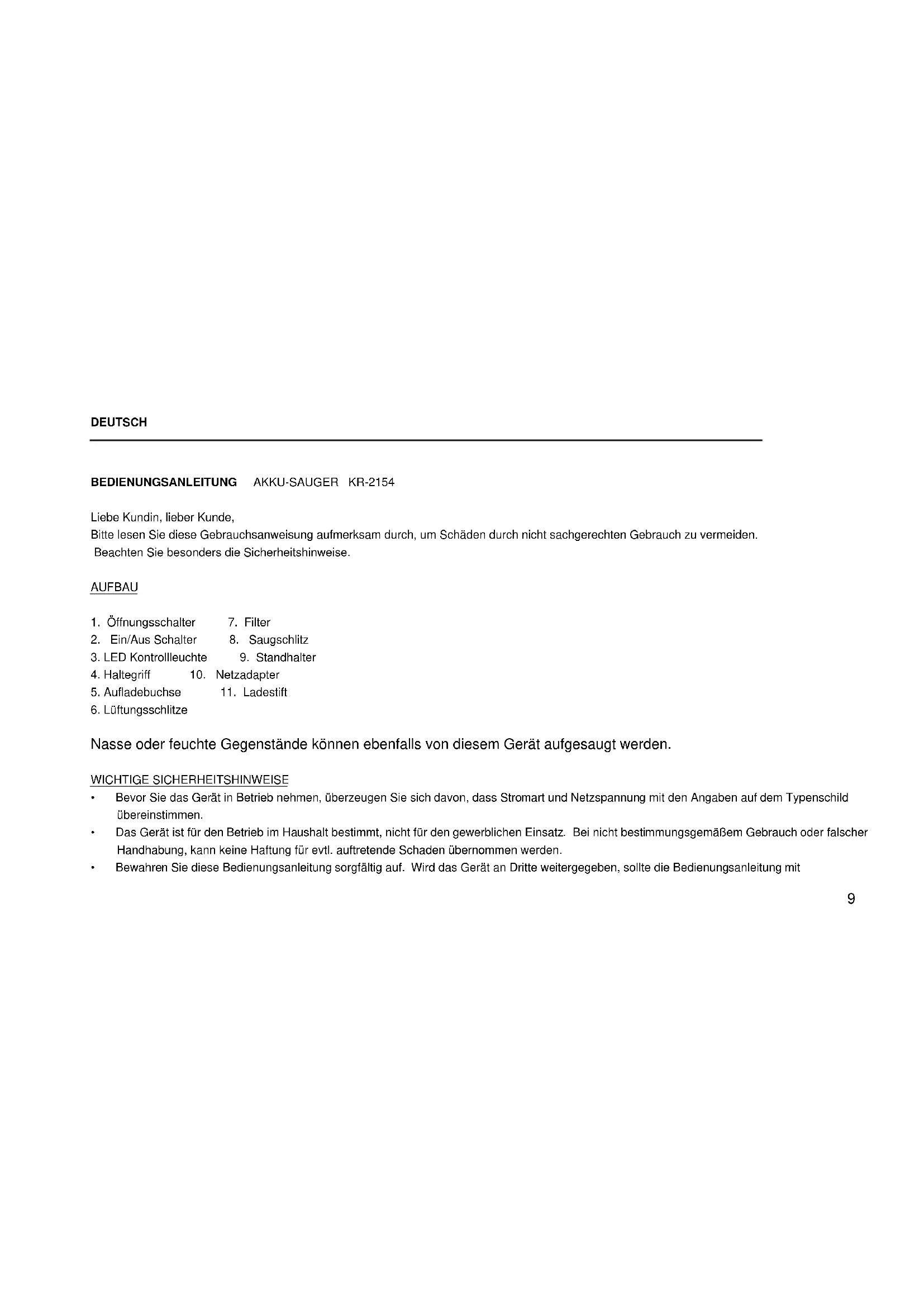 BEDIENUNGSANLEITUNG AKKU-SAUGER KR-2154