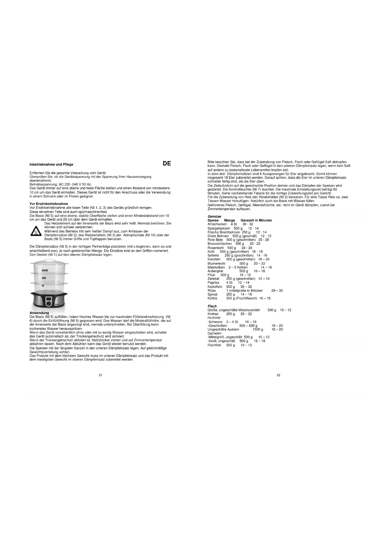 Bitte beachten Sie, dass bei der Zubereitung von Fleisch, Fisch oder Geflügel Saft abtropfen kann. Deshalb Fleisch, Fisch oder Geflügel in den unteren Dämpfeinsatz legen, wenn kein Saft auf andere zu bedampfende Lebensmittel tropfen soll. In allen drei Dämpfeinsätzen sind 6 Aussparungen für Eier angebracht. Somit können insgesamt 18 Eier zubereitet werden. Darauf achten, dass die Eier im unteren Dämpfeinsatz schneller fertig sind, als die Eier oben. Die Zeitschaltuhr auf die gewünschte Position drehen und das Dämpfen der Speisen wird gestartet. Die Kontrollleuchte (Nr. 7) leuchtet. Die maximale Einstellungszeit beträgt 60 Minuten. Siehe nachstehende Tabelle für die richtige Zubereitungszeit pro Gericht. Für die Zubereitung von Reis den Reisbehälter (Nr. 2) benutzen. Für eine Tasse Reis ca. zwei Tassen Wasser hinzufügen. Natürlich auch die Basis mit Wasser füllen. Gefrorenes Fleisch, Geflügel, Meeresfrüchte, etc. nicht im Gerät dämpfen, zuerst bei Zimmertemperatur auftauen. Gemüse Speise Menge Garezeit in Minuten Artischocken 4 St 30 - 32 Spargelspitzen 500 g 12 - 14 Frische Brechbohnen 250 g 12 - 14 Dicke Bohnen 500 g (geschält) 12 - 13 Rote Bete 500 g (geschnitten) 25 - 28 Broccoliröschen 500 g 20.- 22 Rosenkohl 500 g 24 - 26 Kohl 500 g (geschnitten) 16 - 18 Sellerie 250 g (geschnitten) 14 - 16 Karotten 500 g (geschnitten) 18 – 20 Blumenkohl 500 g 20 – 22 Maiskolben 3 – 5 Kolben 14 – 16 Aubergine 500 g 16 – 18 Pilze 500 g 10 – 12 Zwiebel 250 g (geschnitten) 12 – 14 Paprika 4 St 12 – 14 Kartoffeln 500 g 30 – 32 Rübe 1 mittelgroße in Blöcken 28 – 30 Spinat 250 g 14 – 16 Kürbis 500 g (Fruchtfleisch) 16 – 18 Fisch Große, ungeschälte Miesmuscheln 500 g 10 – 12 Krebse 250 g 20 – 22 Hummer -Schwanz 2 – 4 St 16 – 18 -Geschnitten 500 – 600 g 18 – 20 Ungeschälte Austern 1500 g 18 – 20 Garnelen -Mittelgroß, ungeschält 500 g 10 – 12 -Groß, ungeschält 500 g 16 – 18 Fischfilet 500 g 10 – 1223 Fleisch Rindfleischscheiben 500 g 28 – 30 Hamburger / Frikadelle 500 g 16 – 18 Fleischbällchen 500 g 22 – 24 Geflügelscheiben 250 – 500 g 24 – 28 Lammscheiben 500 g 26 – 28 Schweinefleischscheiben 500 g 26 – 28 Hot Dogs/Würstchen 500 g 14 – 18 Eier Weichgekocht 1 – 18 St 15 – 20 Hartgekocht 1 – 18 St 19 – 25