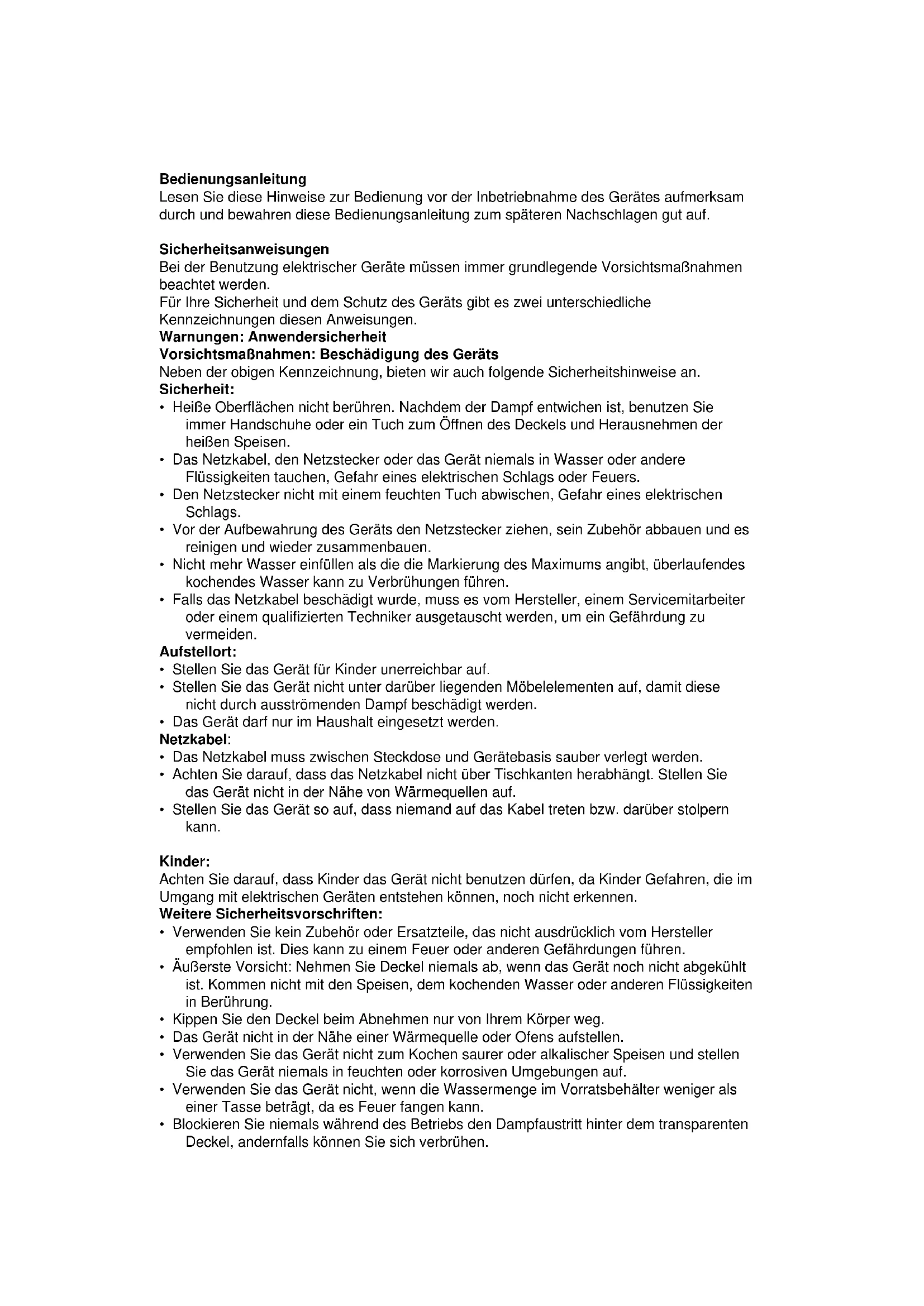 - Äußerste Vorsicht: Nehmen Sie Deckel niemals ab, wenn das Gerät noch nicht abgekühlt ist. Kommen nicht mit den Speisen, dem kochenden Wasser oder anderen Flüssigkeiten in Berührung.