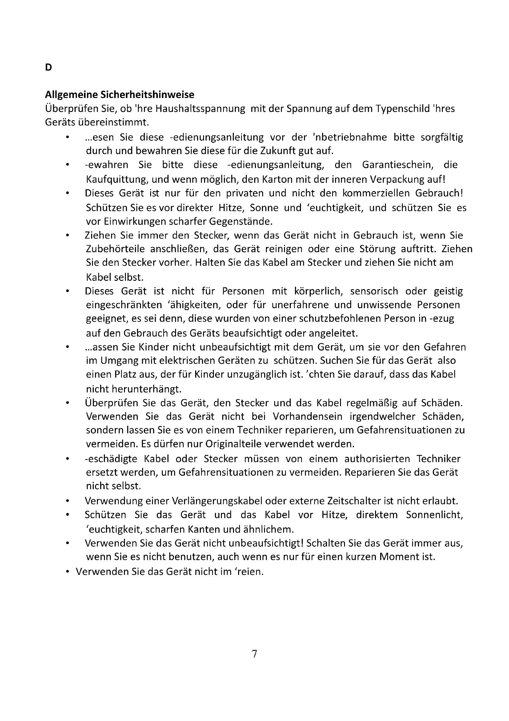 - Dieses Gerät ist nur für den privaten und nicht den kommerziellen Gebrauch! Schützen Sie es vor direkter Hitze, Sonne und Feuchtigkeit, und schützen Sie es vor Einwirkungen scharfer Gegenstände.
