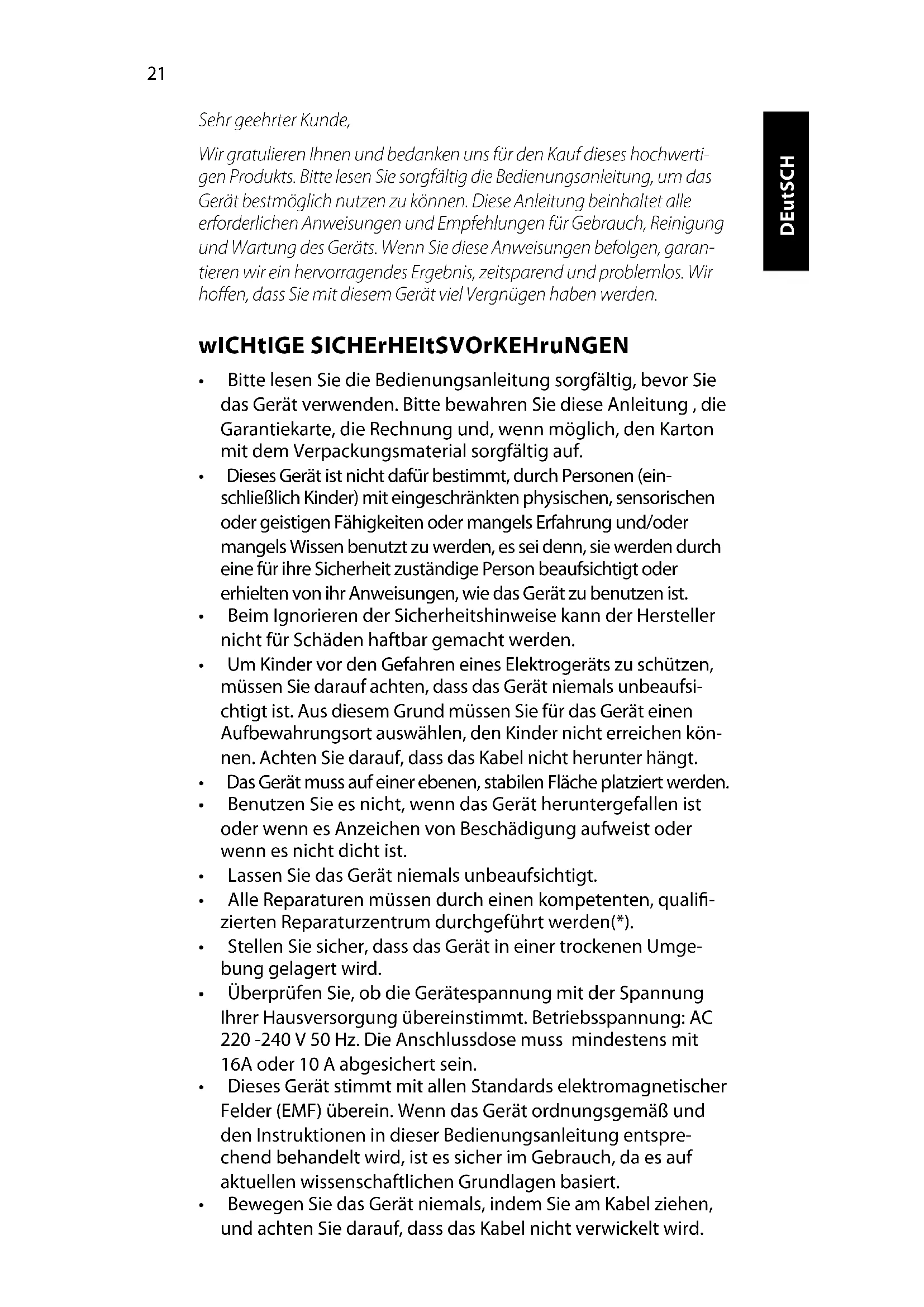 - Tauchen Sie das Gerät niemals in Wasser oder andere Flüs- DEutScH25 sigkeiten. Das Gerät in nicht spülmaschinenfest.