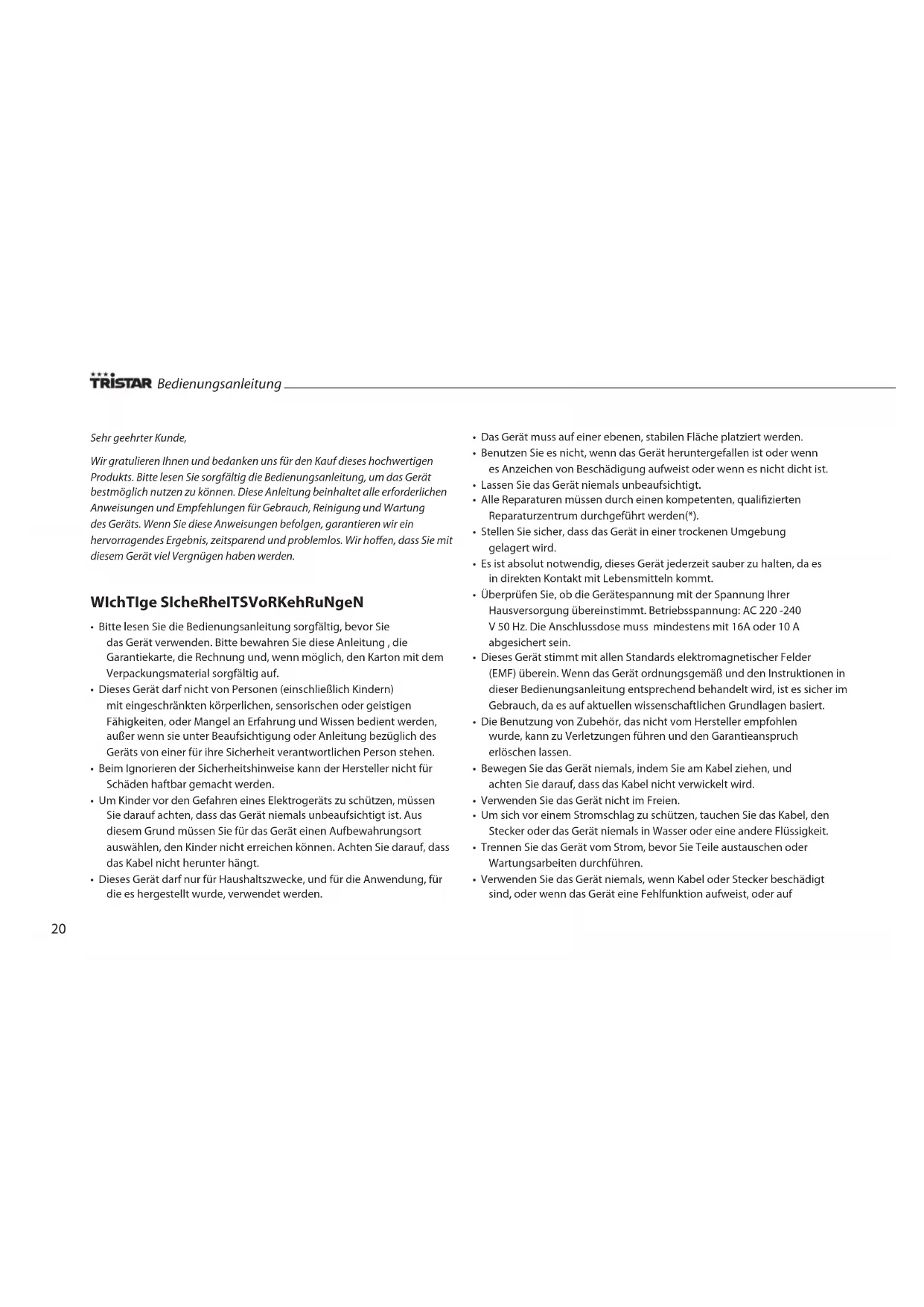 - Beschädigungen, die durch Nichtbefolgen der Bedienungsanleitung entstehen, führen zu einem Garantieverlust, wenn das zu nachfolgenden Beschädigungen führt, kann Tristar nicht zur Verantwortung gezogen werden.
