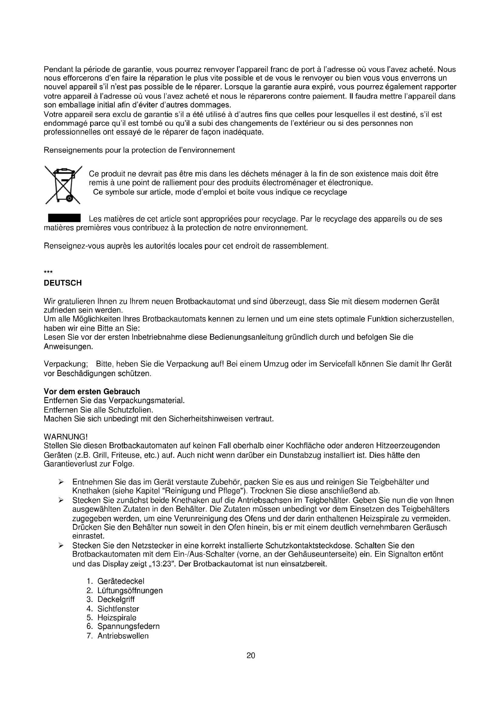 Allgemeine Sicherheitshinweise Lesen Sie vor Inbetriebnahme dieses Gerätes die Bedienungsanleitung sehr sorgfältig durch und bewahren Sie diese inkl. Garantieschein, Kassenbon und nach Möglichkeit den Karton mit Innenverpackung gut auf. Benutzen Sie das Gerät ausschließlich für den privaten und den dafür vorgesehenen Zweck. Dieses Gerät ist nicht für den gewerblichen Gebrauch bestimmt. Benutzen Sie es nicht im Freien (außer es ist für den bedingten Einsatz im Freien vorgesehen). Halten Sie es vor Hitze, direkter Sonneneinstrahlung, Feuchtigkeit (auf keinen Fall in Flüssigkeiten tauchen) und scharfen Kanten fern. Benutzen Sie das Gerät nicht mit feuchten Händen. Bei feucht oder nass gewordenem Gerät sofort den Netzstecker ziehen. Nicht ins Wasser greifen. Schalten Sie das Gerät aus und ziehen Sie immer den Stecker aus der Steckdose (ziehen Sie am Stecker, nicht am Kabel) wenn Sie das Gerät nicht benutzen, Zubehörteile anbringen, zur Reinigung oder bei Störung. Lassen Sie das Gerät niemals unbeaufsichtigt. Um Kinder vor Gefahren elektrischer Geräte zu schützen, sorgen Sie bitte dafür, das Kabel nicht herunter hängt und Kinder keinen Zugriff auf das Gerät haben. Prüfen Sie Gerät und Kabel regelmäßig auf Schäden. Ein beschädigtes Gerät bitte nicht in Betrieb nehmen. Reparieren Sie das Gerät nicht selbst, sondern suchen Sie bitte einen autorisierten Fachmann auf. Um Gefährdungen zu vermeiden, ein defektes Netzkabel bitte nur vom Hersteller, unserem Kundendienst oder einer ähnlich qualifizierten Person durch ein gleichwertiges Kabel ersetzen lassen. Lassen Sie die erhitzten Teile abkühlen, bevor Sie das Gerät verstauen. Bei Weitergabe des Gerätes an Dritte muss auch diese Bedienungsanleitung unbedingt mitgegeben werden! Benutzen Sie das Gerät nur für den vorgesehenen Verwendungszweck. Dieser Brotbackautomat ist nur für den privaten Hausgebrauch geeignet und nicht für gewerbliche Zwecke zu verwenden. Stellen Sie das Gerät auf eine trockene, ebene und hitzebeständige Fläche. Stellen Sie es so auf, dass es nicht verrutschen kann. Diese Gefahr besteht z.B. beim Kneten eines schweren Teiges. Wenn Sie das Gerät auf Holzmöbeln oder ähnlich hitzeempfindlichen Oberflächen betreiben, sollten Sie eine schützende Unterlage verwenden. Stellen Sie das Gerät nie in der Nähe von Hitzequellen oder gar auf einem Herd auf. Gerät und Zuleitung dürfen niemals mit heissen Oberflächen oder offenem Feuer in Berührung kommen. Stellen Sie den Backautomaten nicht in die Nähe einer elektrischen Heizung, einer Gasflamme oder anderer brennbarer Gegenstände (Vorhängen, Tapeten etc-) auf. Achten Sie darauf, dass vorhandene Lüftungsschlitze am Gerät nicht abgedeckt werden, da dadurch unter Umständen ein Hitzestau entstehen kann. Halten Sie beim Aufstellen des Brotbackautomaten einen Mindestabstand von 10 cm zu anderen Geräten ein um gegenseitige Störung zu vermeiden. Bevor Sie das Gerät an das Stromnetz anschließen, überprüfen Sie, ob die auf dem Typenschild angegebene Spannung mit der Netzspannung übereinstimmt. Der Brotbackautomat darf nur an eine korrekt installierte Haushalts-Steckdose mit 230V- angeschlossen werden.22 Der Brotbackautomat darf nur in Betrieb genommen werden, wenn sich der mit Zutaten gefüllte Teigbehälter im Gerät befindet. Ein Betrieb ohne Zutaten könnte zu einer Überhitzung des Gerätes führen. Nehmen Sie die Backform zum Einfüllen der Zutaten immer aus dem Gerät um Verunreinigungen des Backraums zu vermeiden. Füllen Sie keine größeren, als die angegebenen Mengen ein. Benutzen Sie immer Topflappen und ziehen Sie den Netzstecker, bevor Sie den Teigbehälter entnehmen. Lassen Sie die Metallteile abkühlen, bevor Sie sie berühren. Einen zusätzlichen Schutz bietet eine Fehlerstrom-Schutzeinrichtung in der Hausinstallation. Lassen Sie sich von lhrem Elektrofachmann beraten. Prüfen Sie regelmäßig Gerät und Kabel auf Schäden. Das Gerät darf bei Schäden jeglicher Art keinesfalls in Betrieb genommen werden. Senden Sie es in diesen Fällen an Ihre Servicedienststelle, um es untersuchen und reparieren zu lassen. Achten Sie bei der Verwendung eines Verlängerungskabels darauf, dass dieses der Leistung des Gerätes entspricht. Lassen Sie die Zuleitung nicht über die Kante eines Tisches oder der Arbeitsfläche hängen. Achten Sie auf hängende oder liegende Kabel - es besteht Stolpergefahr! Der Brotbackautomat ist nicht für den Gebrauch im Freien bestimmt. Nehmen Sie die Backform während des Betriebes nie heraus! Achten Sie darauf, dass sich das Gehäuse während des Betriebes leicht erwärmt und dass in der Umgebung des Dampfauslasses die Luft stark erhitzt wird. Aus diesem Grund sollten Sie das Gerät nur an einem für Kinder unzugänglichem Ort benutzen. Achtung! Lassen Sie Kinder niemals unbeaufsichtigt mit Elektrogeräten hantieren! In Anwesenheit von Kindern sollten Sie selbst besonders vorsichtig arbeiten. Von der Verwendung anderer als vorn Gerätehersteller empfohlener Zubehörteile ist aus Sicherheitsgründen abzusehen (Verletzungsgefahr). Achten Sie darauf, dass der Innenraum des Gerätes und das Äußere der Backform stets sauber sind. MetalIfolien oder andere Materialien dürfen nicht in das Gerät eingeführt werden (Risiko eines Kurzschlusses oder Brandes). Aus Sicherheitsgründen darf das Gerät niemals, auch nicht während des Timer-Betriebes, unbeaufsichtigt bleiben. Besondere Vorsicht ist beim Bewegen des Gerätes geboten, wenn dieses mit heißen Flüssigkeiten (Konfitüre) gefüllt ist. Stellen Sie den Brotbackautomaten nach beendeter Arbeit an einen sicheren Ort, der Kindern nicht zugänglich ist. Die Teile des Brotbackautomaten sind nicht Spülmaschinengeeignet und dürfen nur per Hand gereinigt werden. Verwenden Sie zurn Reinigen weder scharfe oder scheuernde Reinigungsmittel, noch Lösungsmittel oder Alkohol (siehe Kapitel "Reinigung und Pflege"). Tauchen Sie das Gerät bzw. Kabel oder Stecker keinesfal