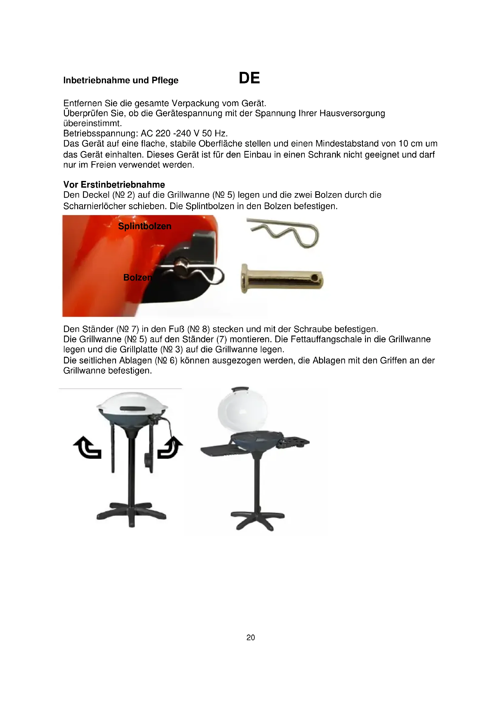 Emballage L’emballage est 100% recyclable, retournez-le séparément. Produit Cet appareil comprend un marquage selon la directive européenne 2002/96/EC relative aux Déchets d’Équipements Électriques et Électroniques (DEEE). En assurant le bon traitement de vos déchets, vous aidez à protéger l'environnement et la santé. Déclaration de conformité CE Cet appareil est conçu, fabriqué et commercialisé conformément aux objectifs de sécurité de la Directive 2006/95/EC sur les « appareils basse tension », aux exigences de sécurité de la Directive 2004/108/EC « Compatibilité électromagnétique » et aux exigences de la Directive 93/68/EEC.20 Inbetriebnahme und Pflege DE Entfernen Sie die gesamte Verpackung vom Gerät. Überprüfen Sie, ob die Gerätespannung mit der Spannung Ihrer Hausversorgung übereinstimmt. Betriebsspannung: AC 220 -240 V 50 Hz. Das Gerät auf eine flache, stabile Oberfläche stellen und einen Mindestabstand von 10 cm um das Gerät einhalten. Dieses Gerät ist für den Einbau in einen Schrank nicht geeignet und darf nur im Freien verwendet werden. Vor Erstinbetriebnahme Den Deckel (Nr. 2) auf die Grillwanne (Nr. 5) legen und die zwei Bolzen durch die Scharnierlöcher schieben. Die Splintbolzen in den Bolzen befestigen.