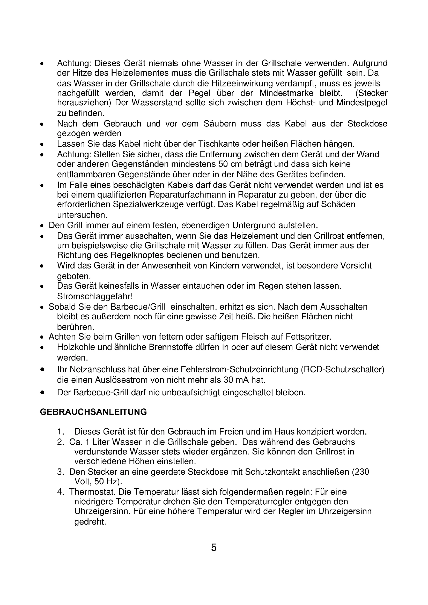 DEUTSCH WICHTIGE SICHERHEITSVORSCHRIFTEN Das Gerät eignet sich ausschließlich für den Hausgebrauch und darf nur für den angegebenen Zweck benutzt werden.5 Achtung: Dieses Gerät niemals ohne Wasser in der Grillschale verwenden. Aufgrund der Hitze des Heizelementes muss die Grillschale stets mit Wasser gefüllt sein. Da das Wasser in der Grillschale durch die Hitzeeinwirkung verdampft, muss es jeweils nachgefüllt werden, damit der Pegel über der Mindestmarke bleibt. (Stecker herausziehen) Der Wasserstand sollte sich zwischen dem Höchst- und Mindestpegel zu befinden. Nach dem Gebrauch und vor dem Säubern muss das Kabel aus der Steckdose gezogen werden Lassen Sie das Kabel nicht über der Tischkante oder heißen Flächen hängen. Achtung: Stellen Sie sicher, dass die Entfernung zwischen dem Gerät und der Wand oder anderen Gegenständen mindestens 50 cm beträgt und dass sich keine entflammbaren Gegenstände über oder in der Nähe des Gerätes befinden. Im Falle eines beschädigten Kabels darf das Gerät nicht verwendet werden und ist es bei einem qualifizierten Reparaturfachmann in Reparatur zu geben, der über die erforderlichen Spezialwerkzeuge verfügt. Das Kabel regelmäßig auf Schäden untersuchen. Den Grill immer auf einem festen, ebenerdigen Untergrund aufstellen. Das Gerät immer ausschalten, wenn Sie das Heizelement und den Grillrost entfernen, um beispielsweise die Grillschale mit Wasser zu füllen. Das Gerät immer aus der Richtung des Regelknopfes bedienen und benutzen. Wird das Gerät in der Anwesenheit von Kindern verwendet, ist besondere Vorsicht geboten. Das Gerät keinesfalls in Wasser eintauchen oder im Regen stehen lassen. Stromschlaggefahr! Sobald Sie den Barbecue/Grill einschalten, erhitzt es sich. Nach dem Ausschalten bleibt es außerdem noch für eine gewisse Zeit heiß. Die heißen Flächen nicht berühren. Achten Sie beim Grillen von fettem oder saftigem Fleisch auf Fettspritzer. Holzkohle und ähnliche Brennstoffe dürfen in oder auf diesem Gerät nicht verwendet werden. Ihr Netzanschluss hat über eine Fehlerstrom-Schutzeinrichtung (RCD-Schutzschalter) die einen Auslösestrom von nicht mehr als 30 mA hat. Der Barbecue-Grill darf nie unbeaufsichtigt eingeschaltet bleiben. GEBRAUCHSANLEITUNG