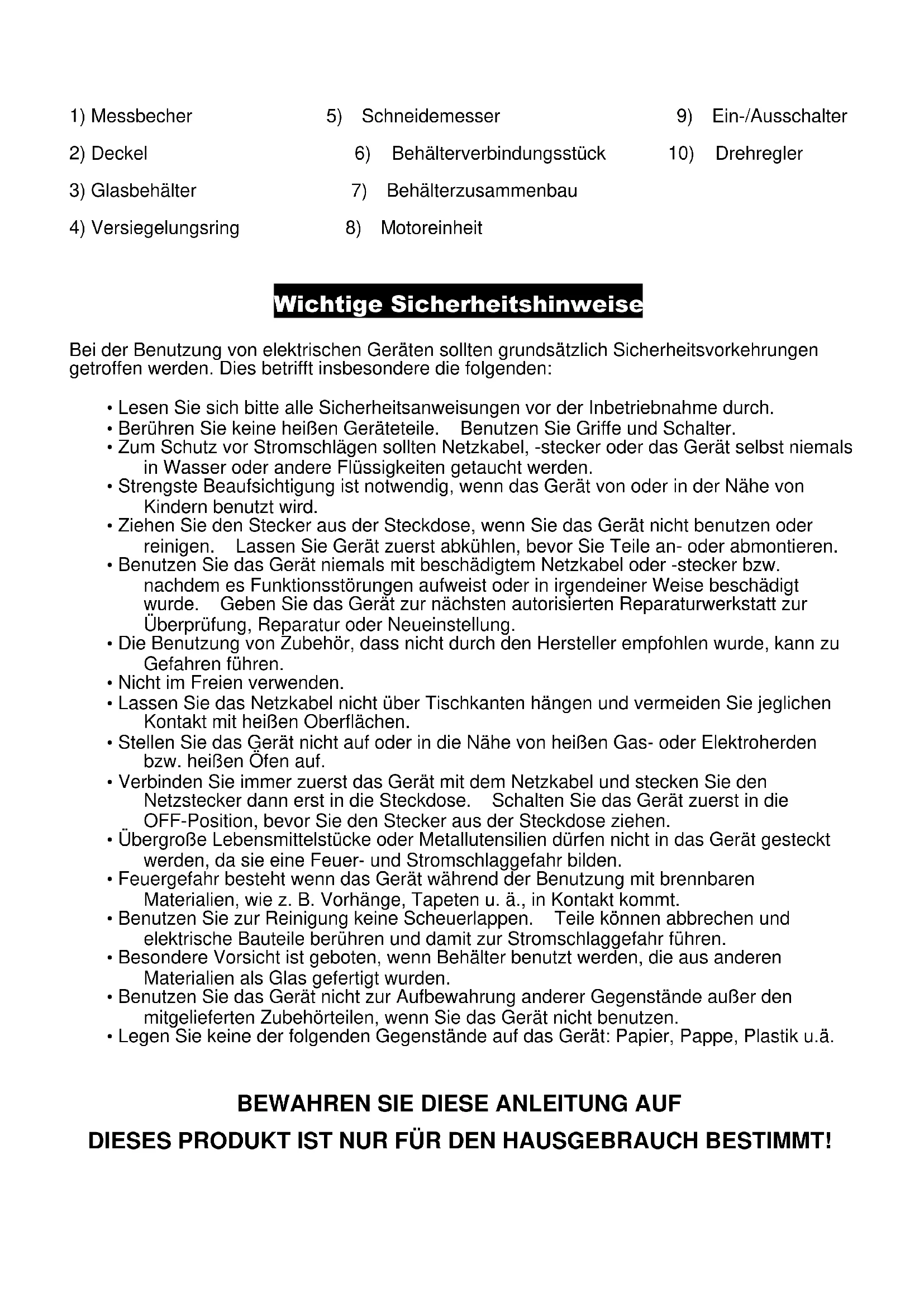 Bedienungsanleitung Teile & Verpackungsinhalt1) Messbecher 5) Schneidemesser 9) Ein-/Ausschalter